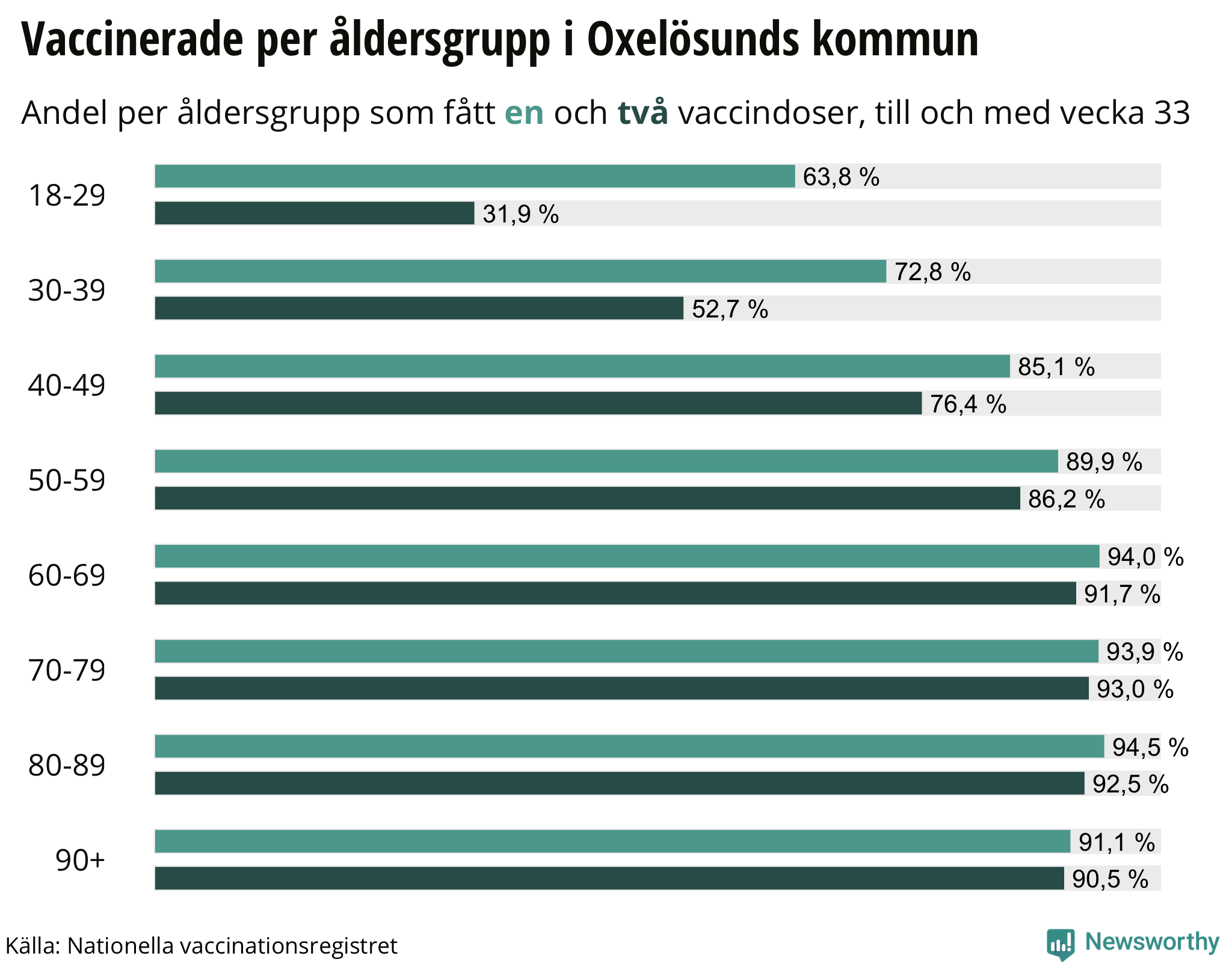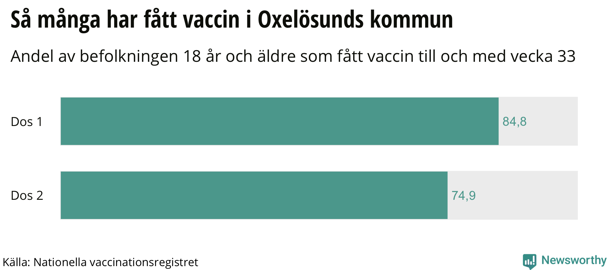 Totalt har 8 108 personer i Oxelösund fått sin första vaccindos fram till vecka 33, enligt Nationella vaccinationsregistret.