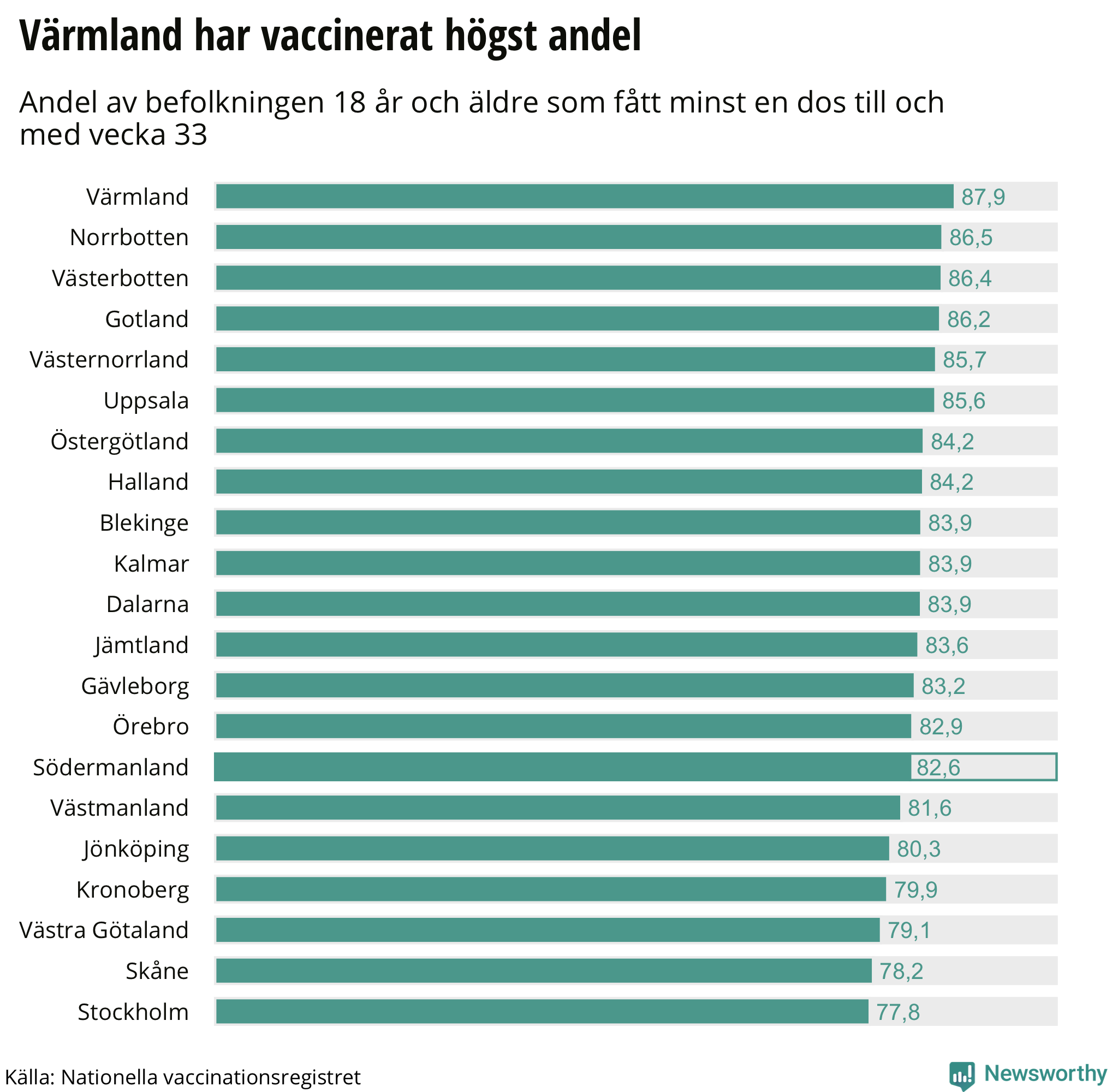 I hela Södermanlands län har 193 342 doser getts ut fram till vecka 33, vilket motsvarar 83 procent av den vuxna befolkningen.