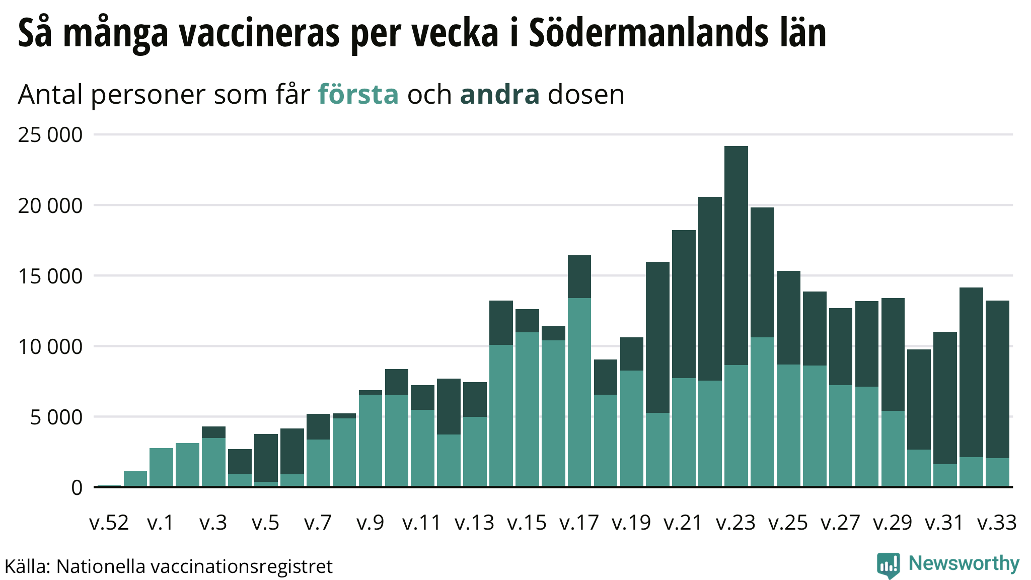 Förra veckan delades totalt 13 229 vaccindoser ut i Södermanlands län (veckostatistiken finns än så länge bara på regionnivå). Det är ungefär lika många som veckan innan. Följande bild visar utvecklingen vecka för vecka.