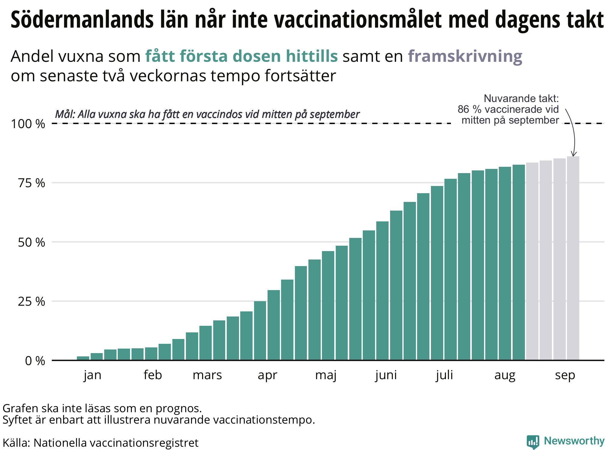 I dagens tempo, baserat på antalet som fått en första dos de senaste två veckorna, kommer 86 procent av alla vuxna i Södermanlands län att ha fått minst en vaccindos vid mitten på september. Det skulle dröja fyra månader innan målet nås.