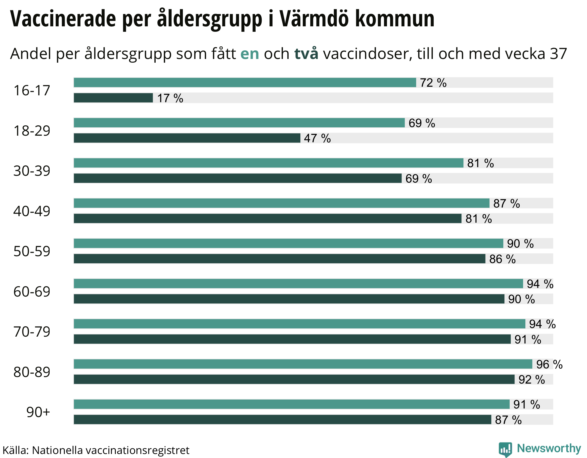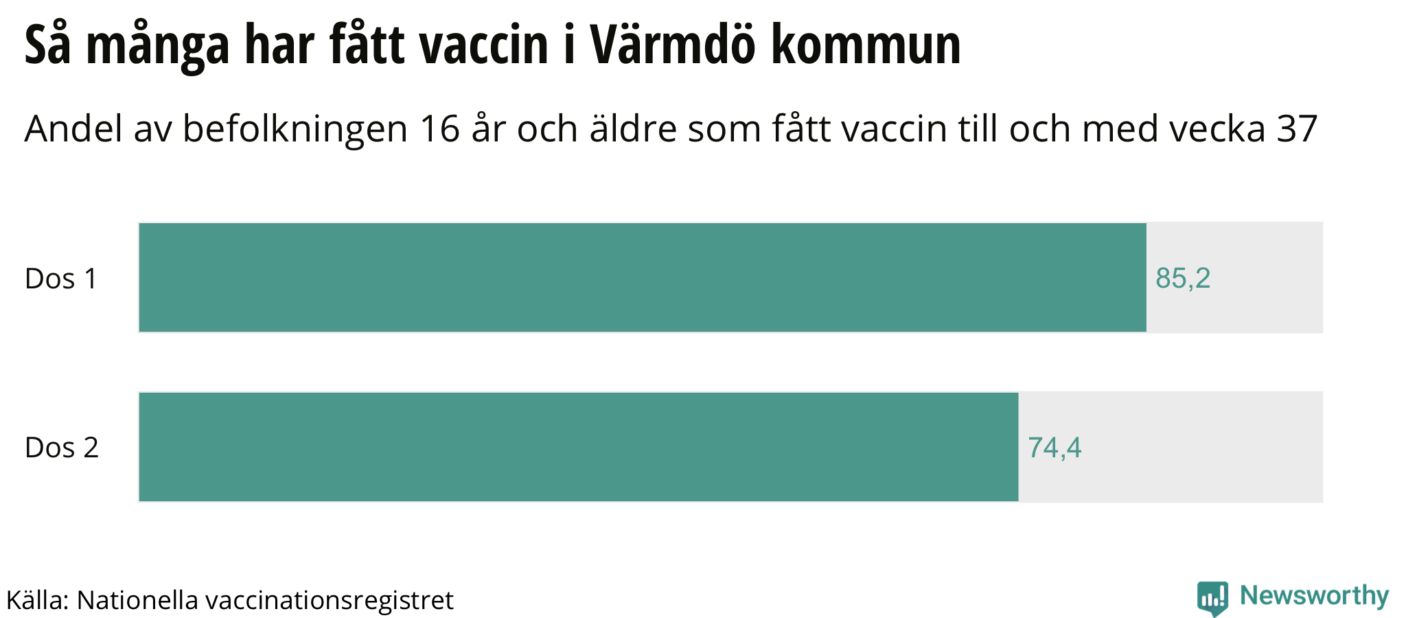 Totalt har 31 136 personer i Värmdö fått sin första vaccindos fram till vecka 37, enligt Nationella vaccinationsregistret.