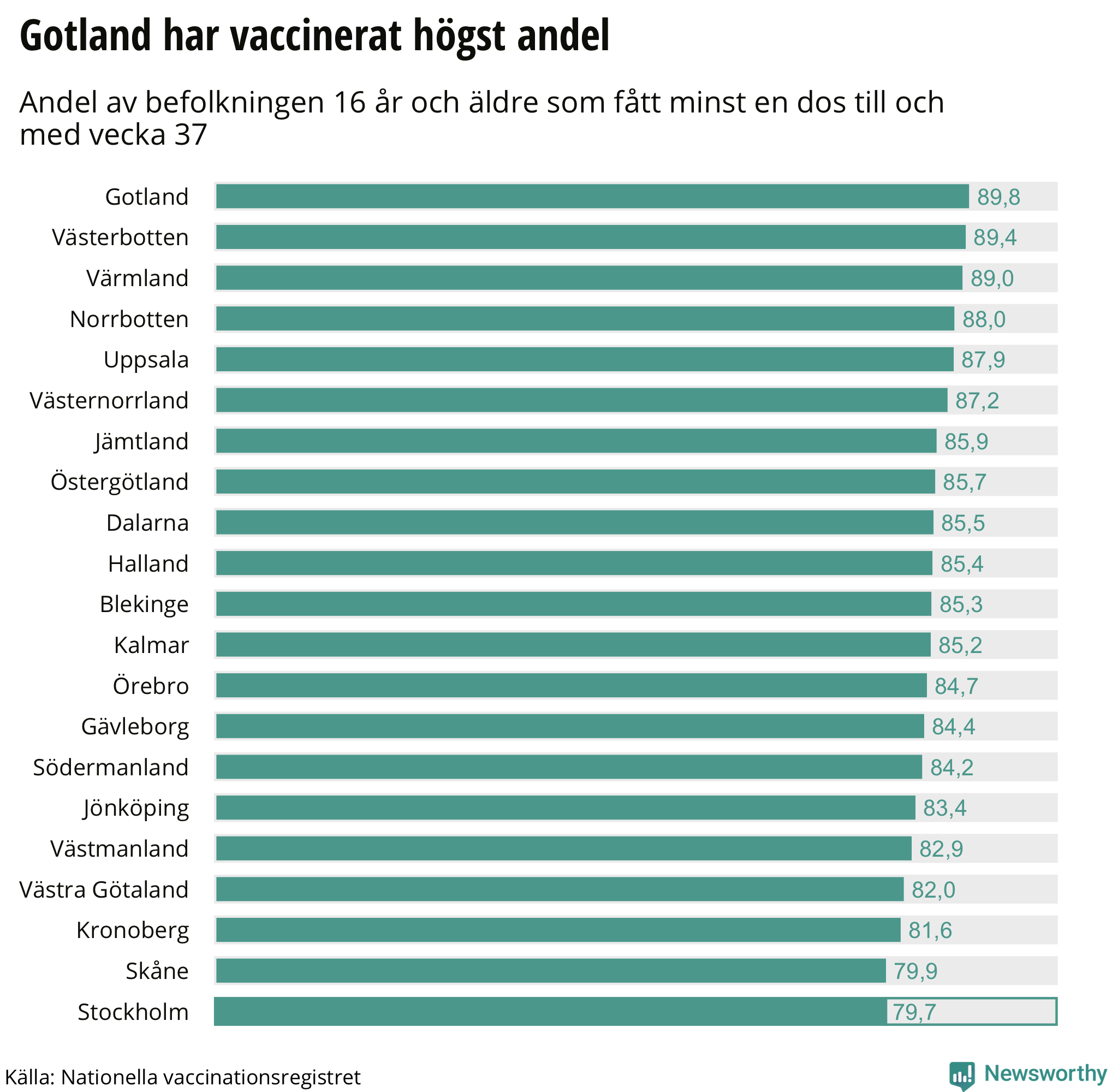 Totalt har 7 115 096 personer i hela Sverige fått minst en dos, vilket motsvarar 83 procent av landets befolkning, fram tills 23 september. 76 procent har fått bägge doserna.
