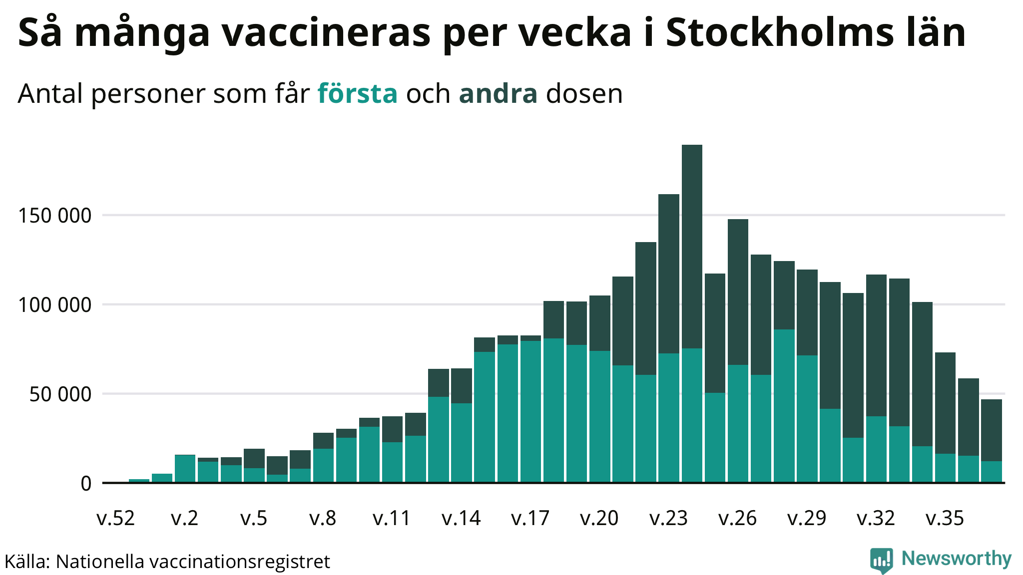 Förra veckan delades totalt 46 852 vaccindoser ut i Stockholms län (veckostatistiken finns än så länge bara på regionnivå). Det är färre än veckan innan (−11 629 personer). Följande bild visar utvecklingen vecka för vecka.