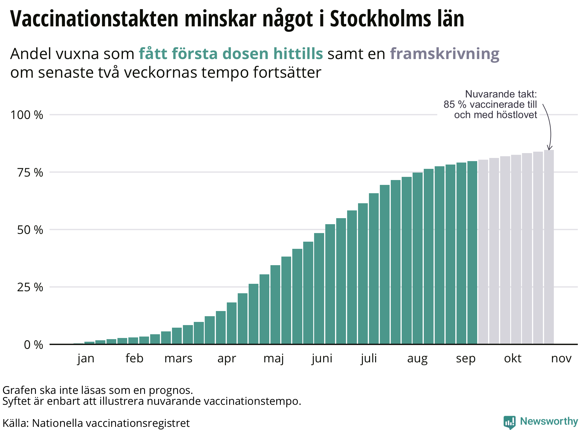 Den här grafen ska dock läsas med en nypa salt. Syftet är enbart att illustrera nuvarande takt, inte att förutspå läget. Vaccinleveranser är högre än de varit under början av året, men å andra sidan går numera allra största delen till andra vaccindoser.