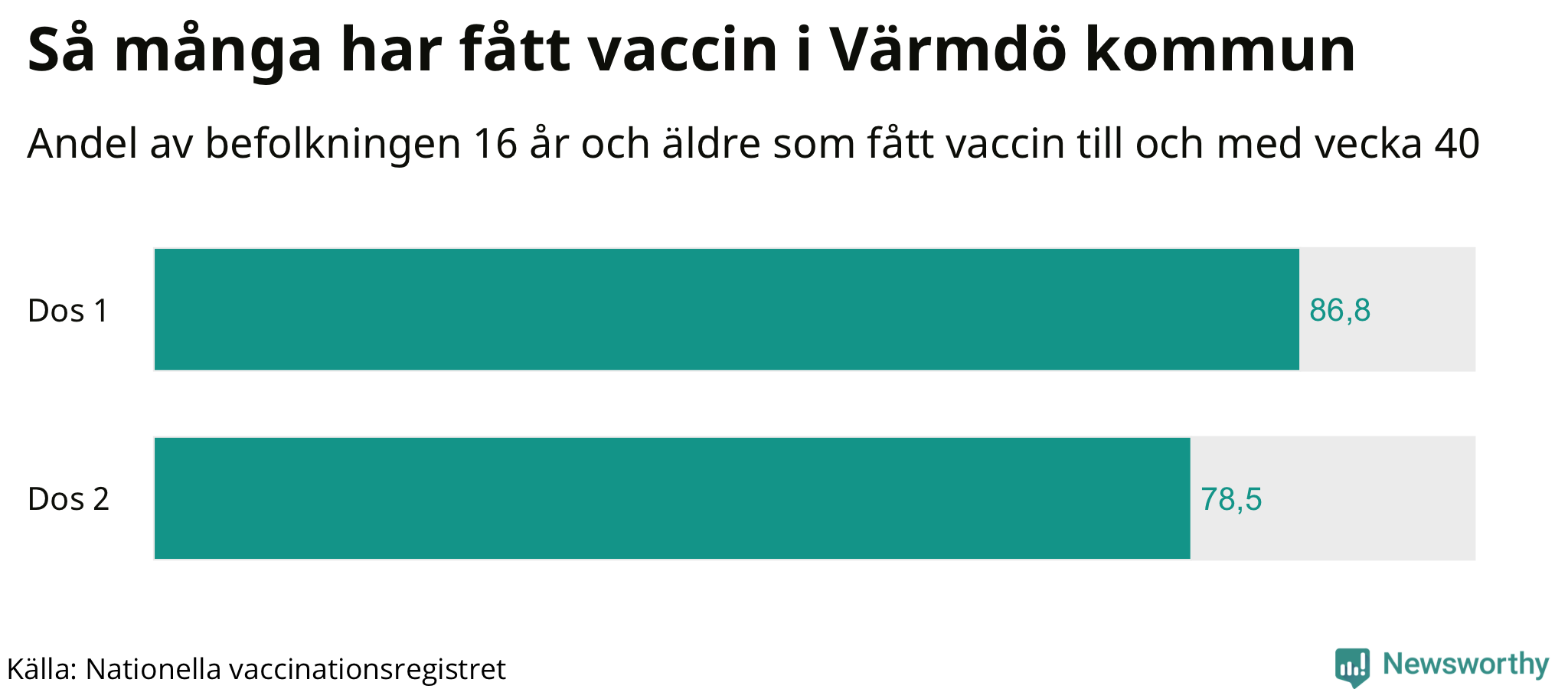 Det innebär att 87 procent av befolkningen född 2005 eller tidigare fått minst en dos. Det är en ganska genomsnittlig andel. Hammarö kommun har vaccinerat flest i hela landet (94 procent).