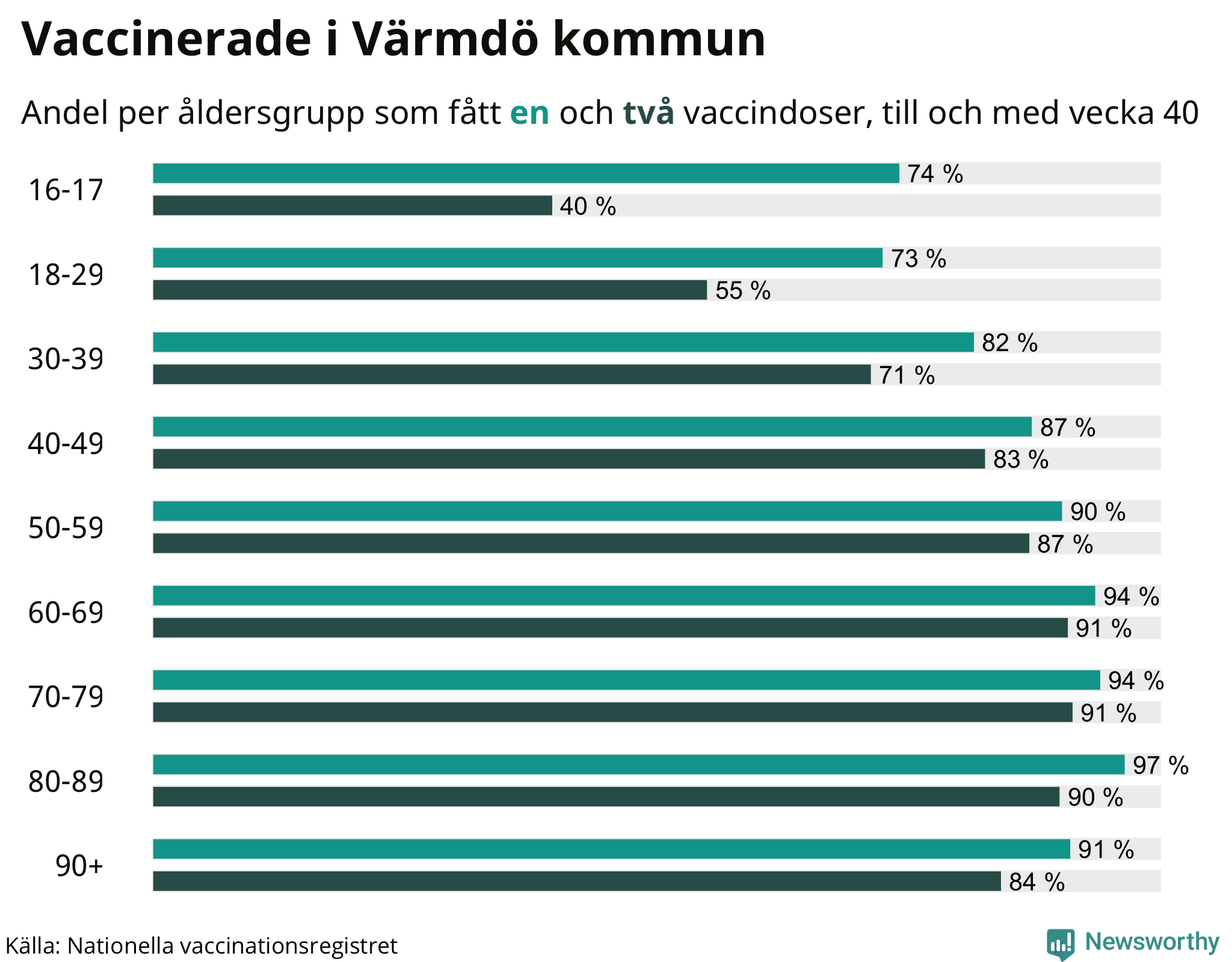 Totalt har 31 718 personer i Värmdö fått sin första vaccindos fram till vecka 40, enligt Nationella vaccinationsregistret.