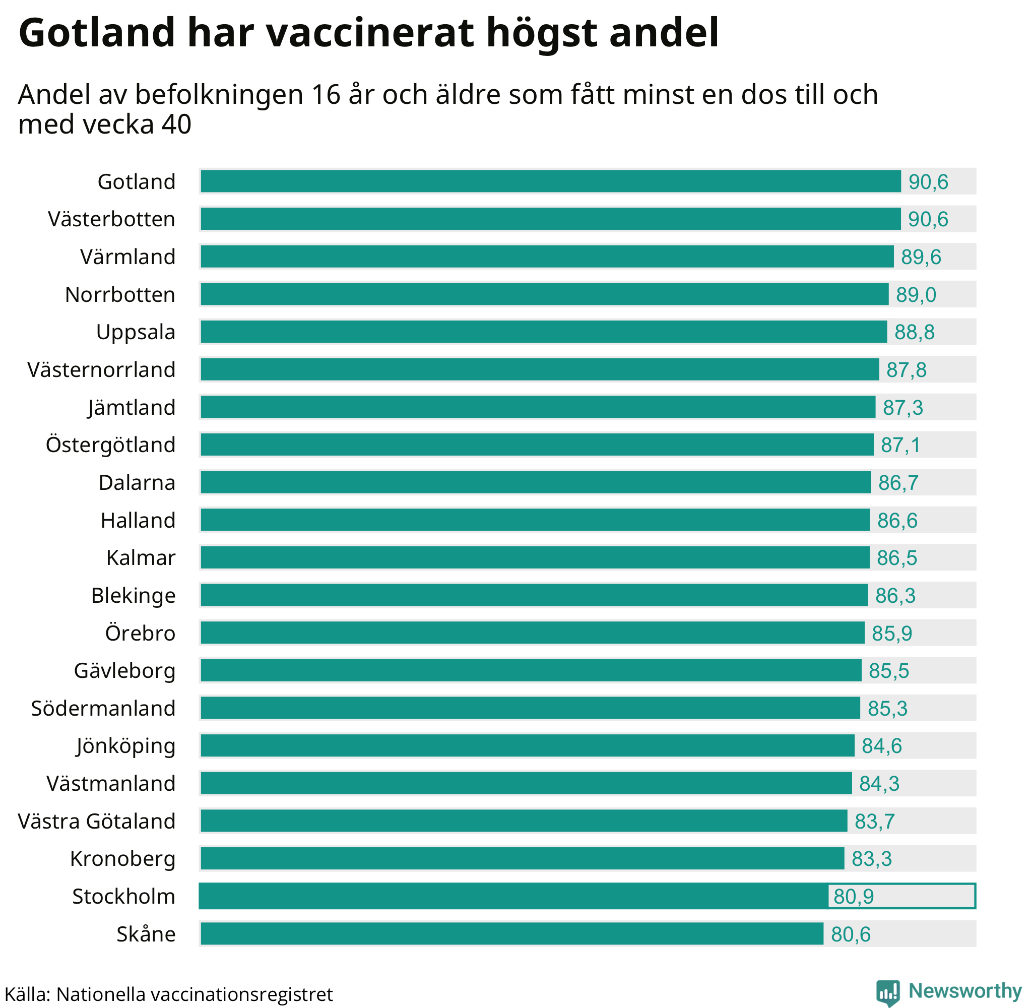 I hela Stockholms län har 1 579 340 doser getts ut fram till vecka 40, vilket motsvarar 81 procent av befolkningen som är 16 år och äldre.