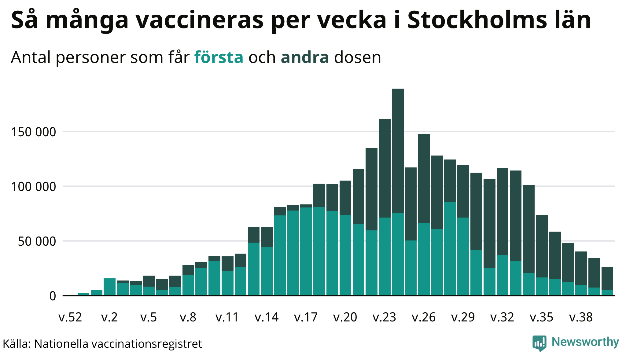 Förra veckan delades totalt 26 225 vaccindoser ut i Stockholms län (veckostatistiken finns än så länge bara på regionnivå). Det är färre än veckan innan (−8 333 personer). Följande bild visar utvecklingen vecka för vecka.