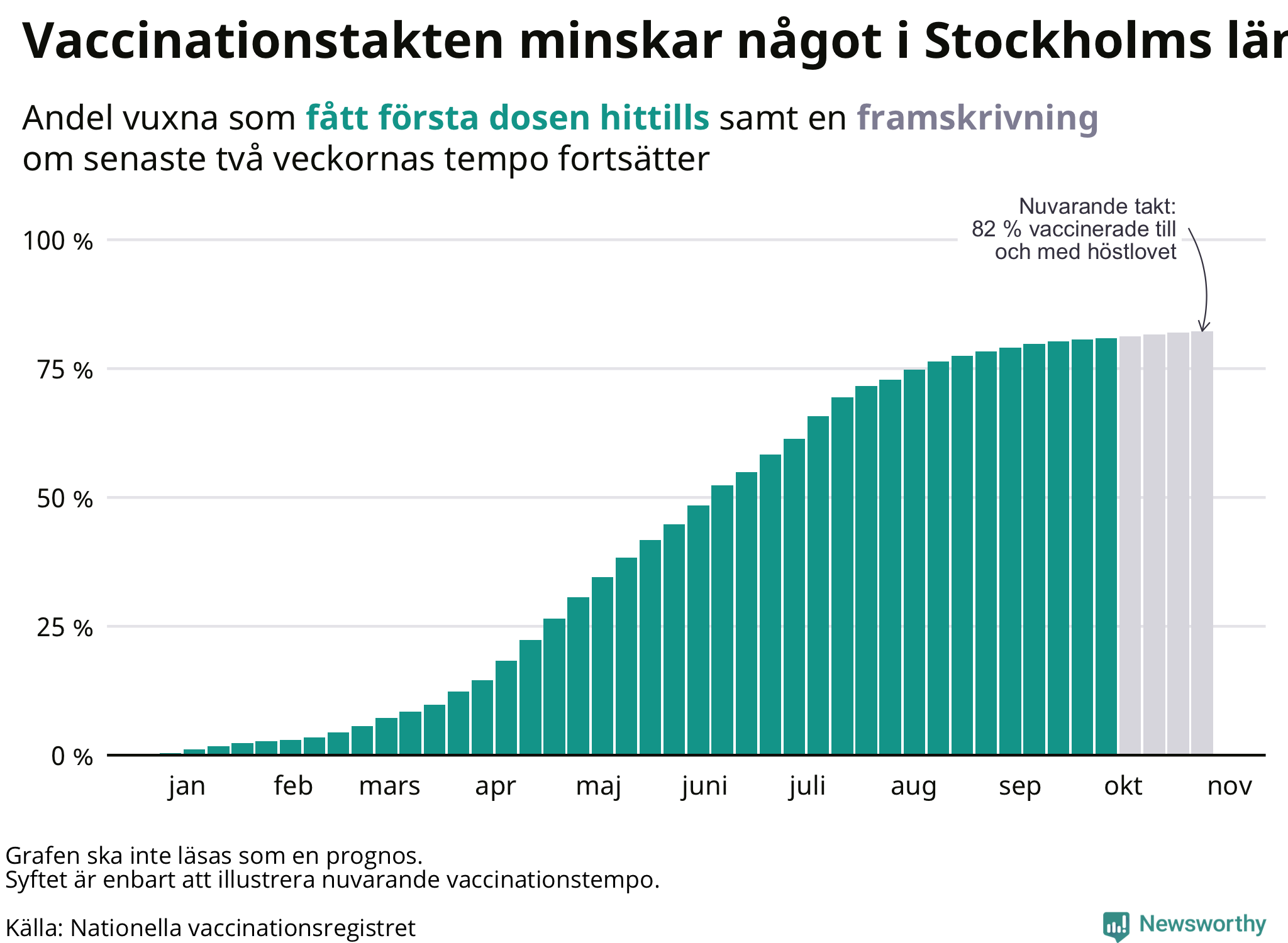 Den här grafen ska dock läsas med en nypa salt. Syftet är enbart att illustrera nuvarande takt, inte att förutspå läget. Vaccinleveranser är högre än de varit under början av året, men å andra sidan går numera allra största delen till andra vaccindoser.