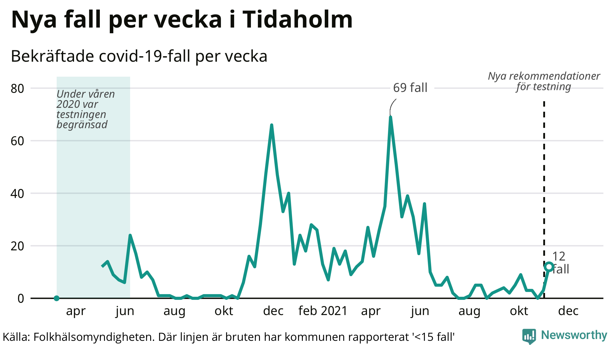 Under vecka 44 rapporterades tolv nya bekräftade fall av covid-19 i Tidaholms kommun. Det är en klar uppgång jämfört med den föregående veckan (+9 fall). Den högsta noteringen för Tidaholm gjordes i april 2021: 69 nya fall under en vecka.