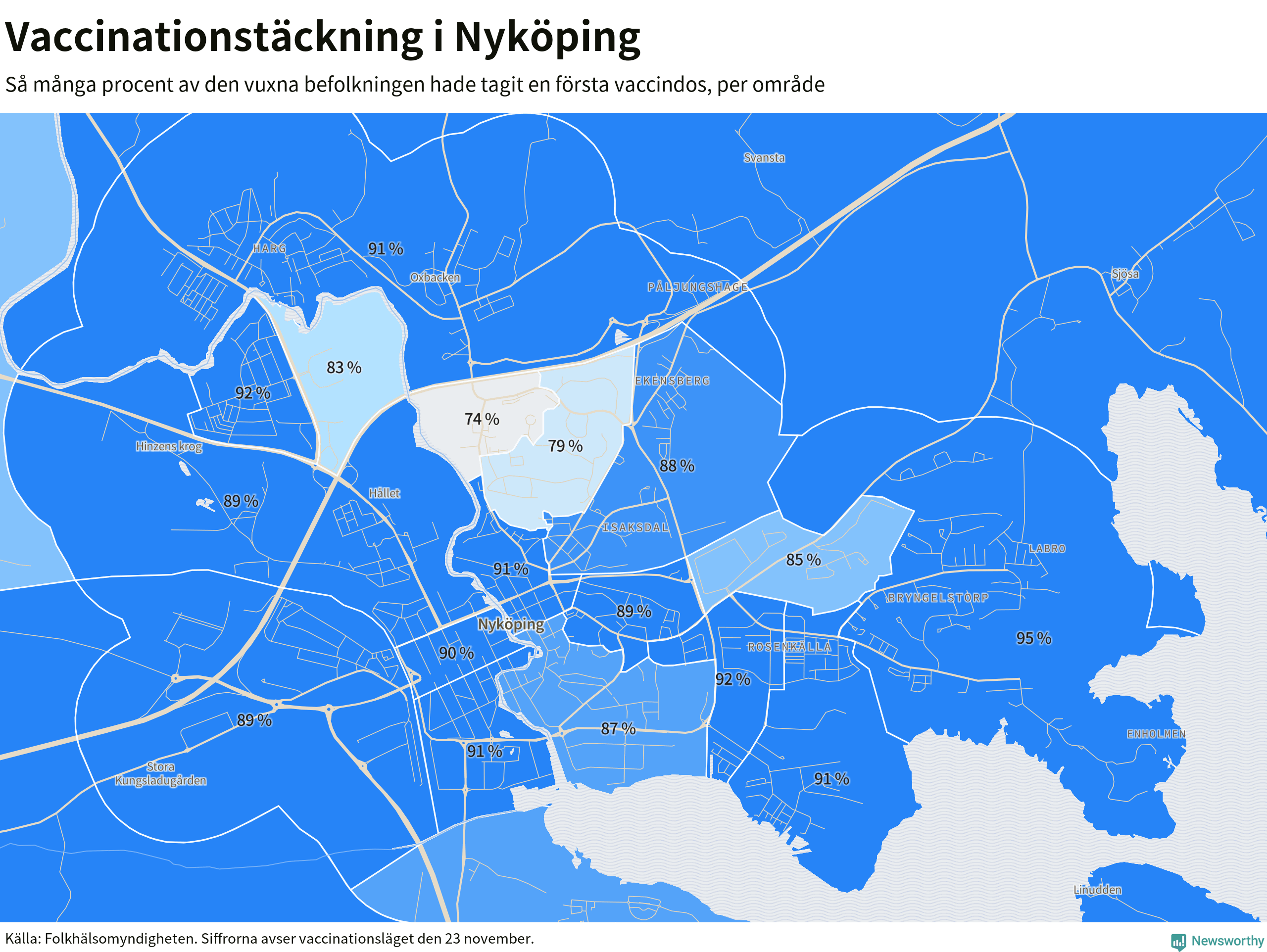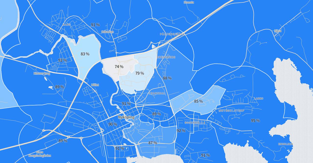 Det finns fortfarande ett områden i Nyköping där färre än 75 procent av den vuxna befolkningen inte tagit en första dos vaccin. Det är lika många som i oktober. Lägst vaccinationsgrad finns i delar av Brandkärr, där 74 procent tagit första dosen.