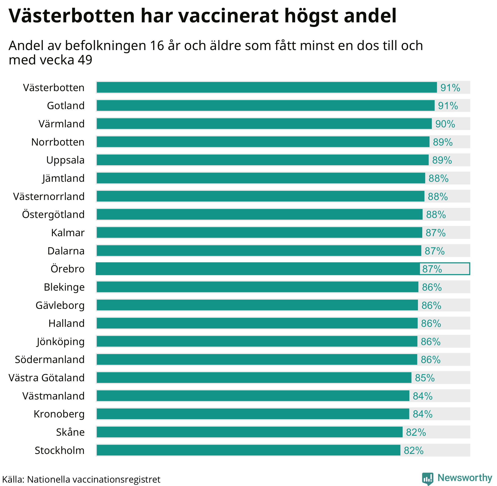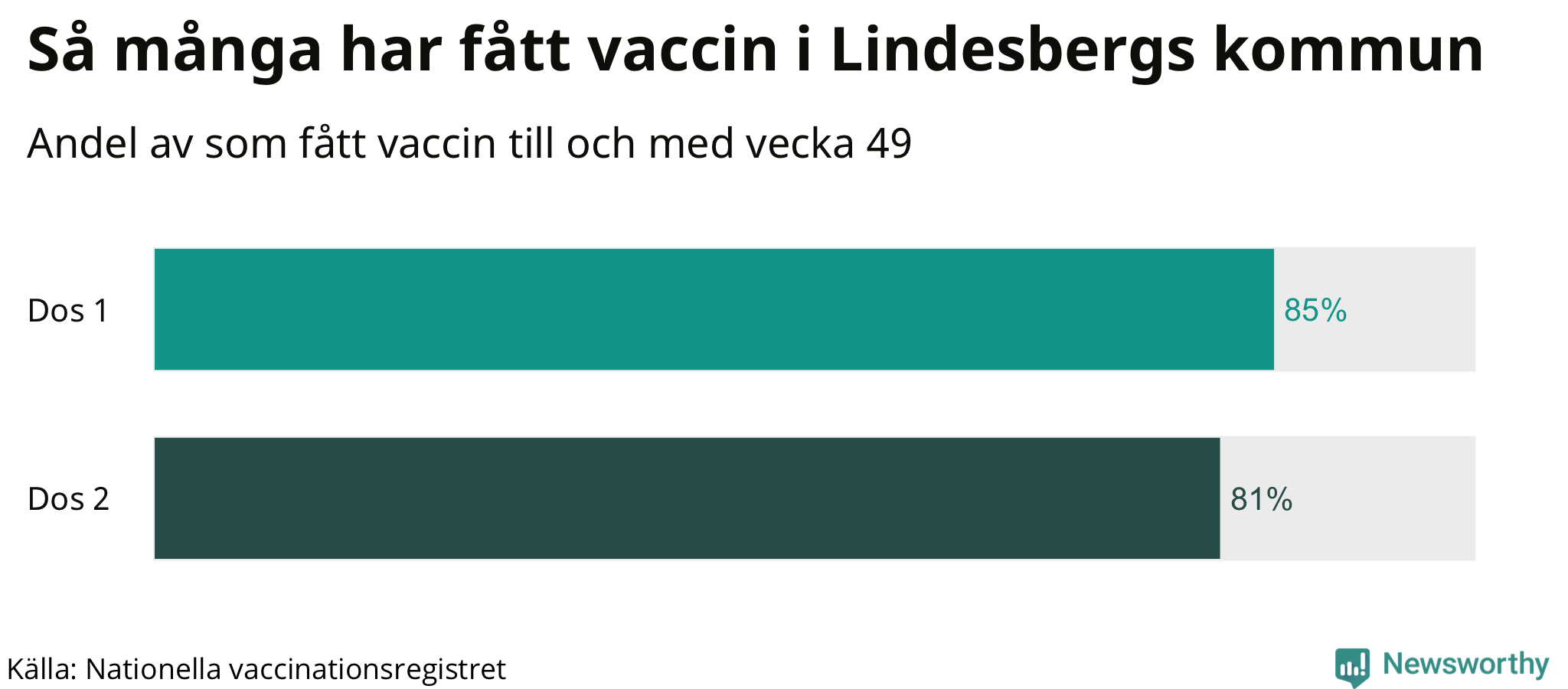 Totalt har 17 630 personer i Lindesberg fått sin första vaccindos fram till vecka 49, enligt Nationella vaccinationsregistret. Det innebär att 85 procent av befolkningen fått minst en dos. Det är en lägre andel än i de flesta andra kommuner. Hammarö kommun har vaccinerat flest i hela landet (94 procent).