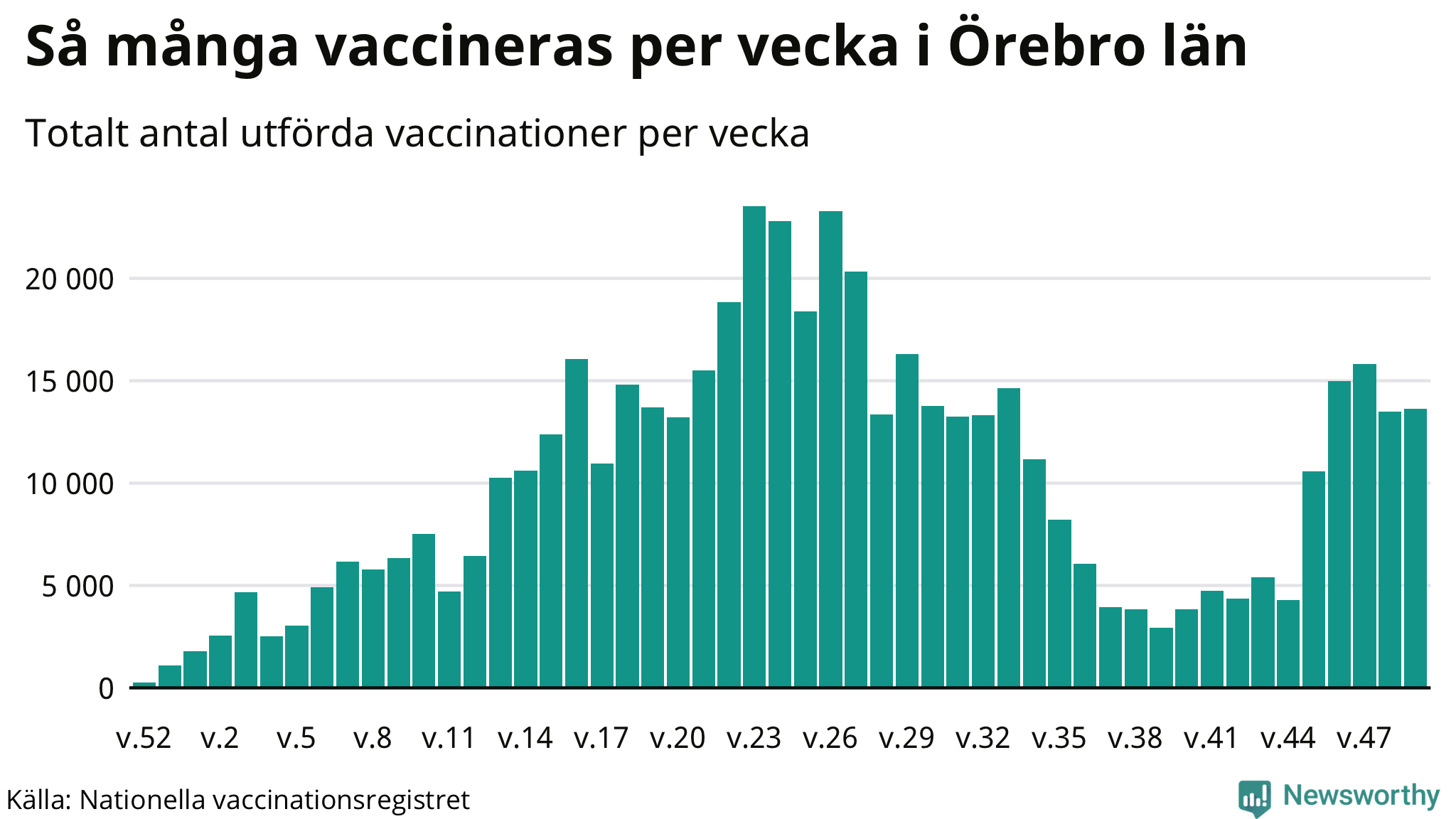 I massvaccinationens mest intensiva fas, i juni, delades som mest mer än 23 000 vaccindoser i veckan ut i Örebro län. I takt med att de flesta fått sin första dos har tempot minskat. Nu pågår vaccinationen av 12-15-åringar och utdelningen av tredje dosen.