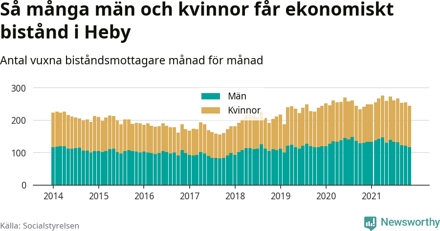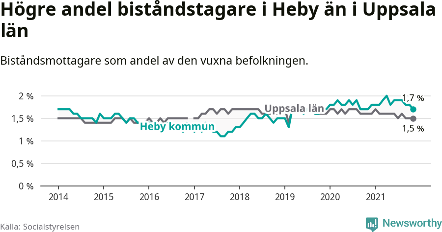 Totalt fick 245 personer i Heby kommun ekonomiskt bistånd stöd under november, vilket alltså motsvarar 1,7 procent av den vuxna befolkningen. Det är en minskning med 0,1 procentenheter från månaden innan, vilket motsvarar tio personer. I Uppsala län som helhet var andelen 1,5 procent, vilket är ungefär samma nivå som månaden innan.