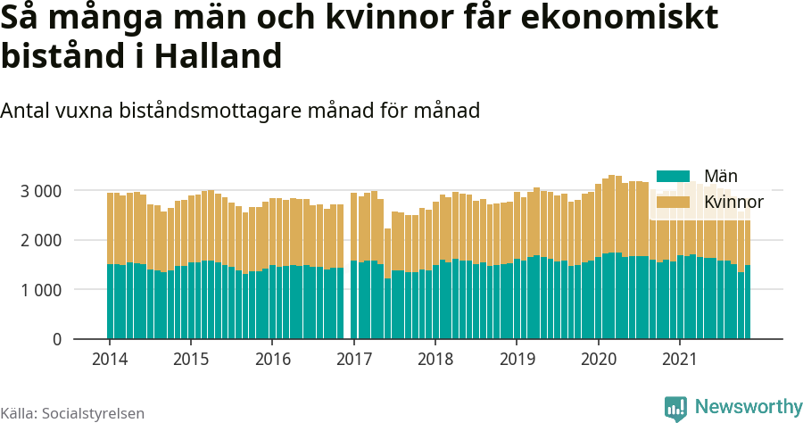 Av biståndstagarna i Hallands län var förra månaden 1 353 kvinnor och 1 486 män.