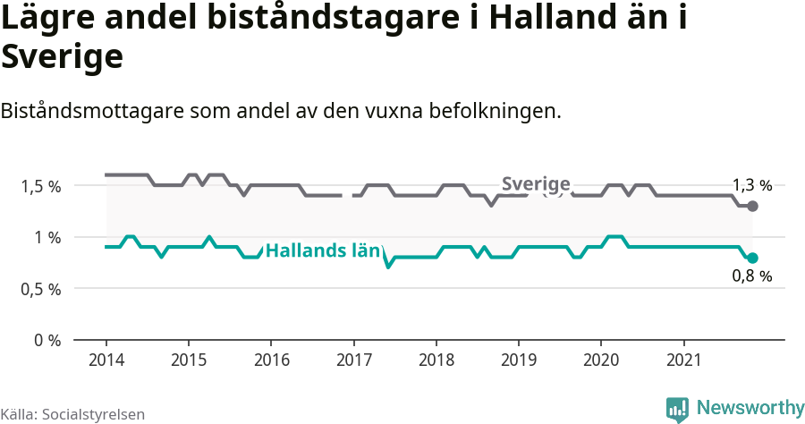 Totalt fick 2 839 personer i Hallands län ekonomiskt bistånd stöd under november, vilket alltså motsvarar 0,8 procent av den vuxna befolkningen. Det är ungefär lika stor andel som föregående månad. Sedan samma månad förra året innebär det en minskning med 0,1 procentenheter.