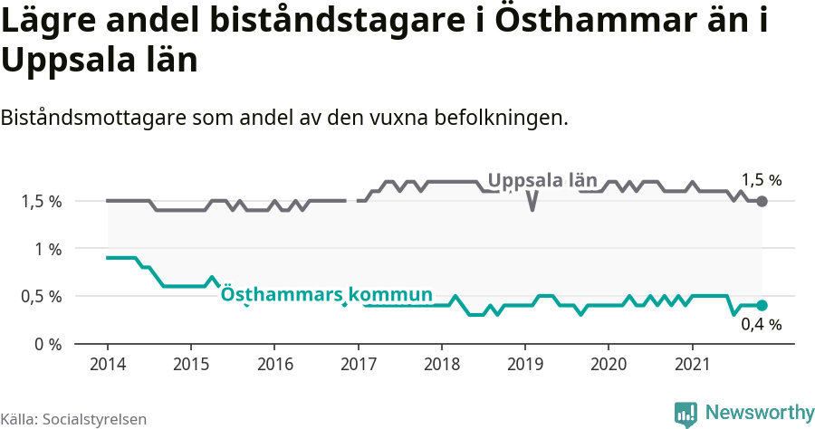 Totalt fick 86 personer i Östhammars kommun ekonomiskt bistånd stöd under november, vilket alltså motsvarar 0,4 procent av den vuxna befolkningen. Det är ungefär lika stor andel som föregående månad. Sedan samma månad förra året innebär det en minskning med 0,1 procentenheter. I Uppsala län som helhet var andelen 1,5 procent, vilket är ungefär samma nivå som månaden innan.