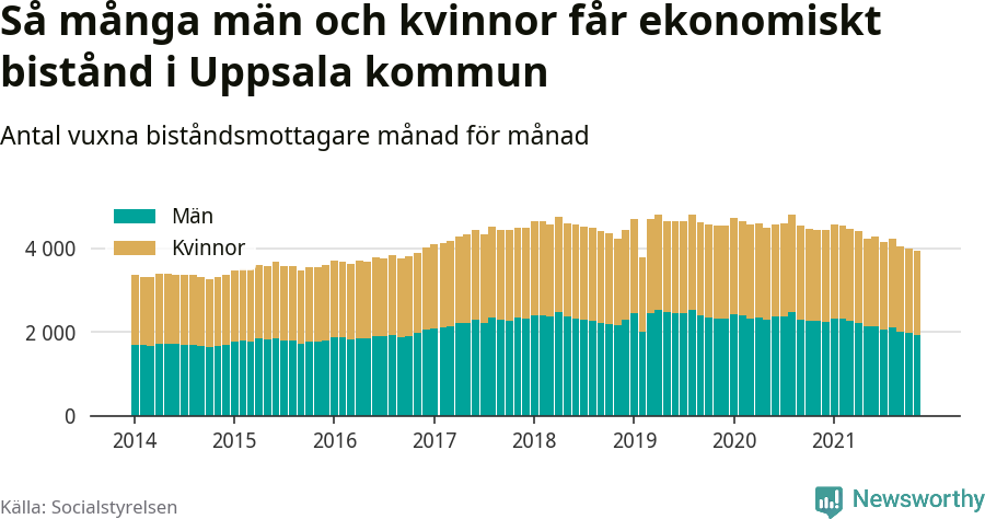 Av biståndstagarna i Uppsala kommun var förra månaden 2 017 kvinnor och 1 928 män.