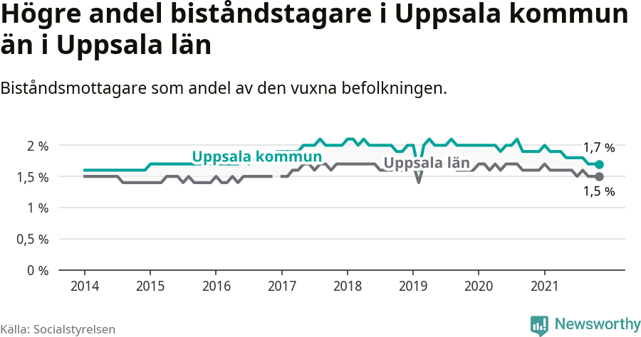 Totalt fick 3 945 personer i Uppsala kommun ekonomiskt bistånd stöd under november, vilket alltså motsvarar 1,7 procent av den vuxna befolkningen. Det är ungefär lika stor andel som föregående månad. Sedan samma månad förra året innebär det en minskning med 0,2 procentenheter. I Uppsala län som helhet var andelen 1,5 procent, vilket är ungefär samma nivå som månaden innan.