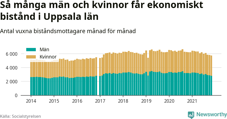 Av biståndstagarna i Uppsala län var förra månaden 2 925 kvinnor och 2 814 män.