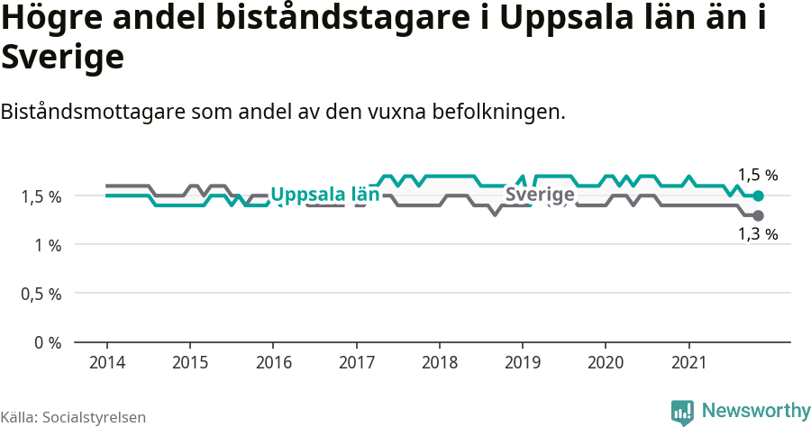 Totalt fick 5 739 personer i Uppsala län ekonomiskt bistånd stöd under november, vilket alltså motsvarar 1,5 procent av den vuxna befolkningen. Det är ungefär lika stor andel som föregående månad. Sedan samma månad förra året innebär det en minskning med 0,1 procentenheter.