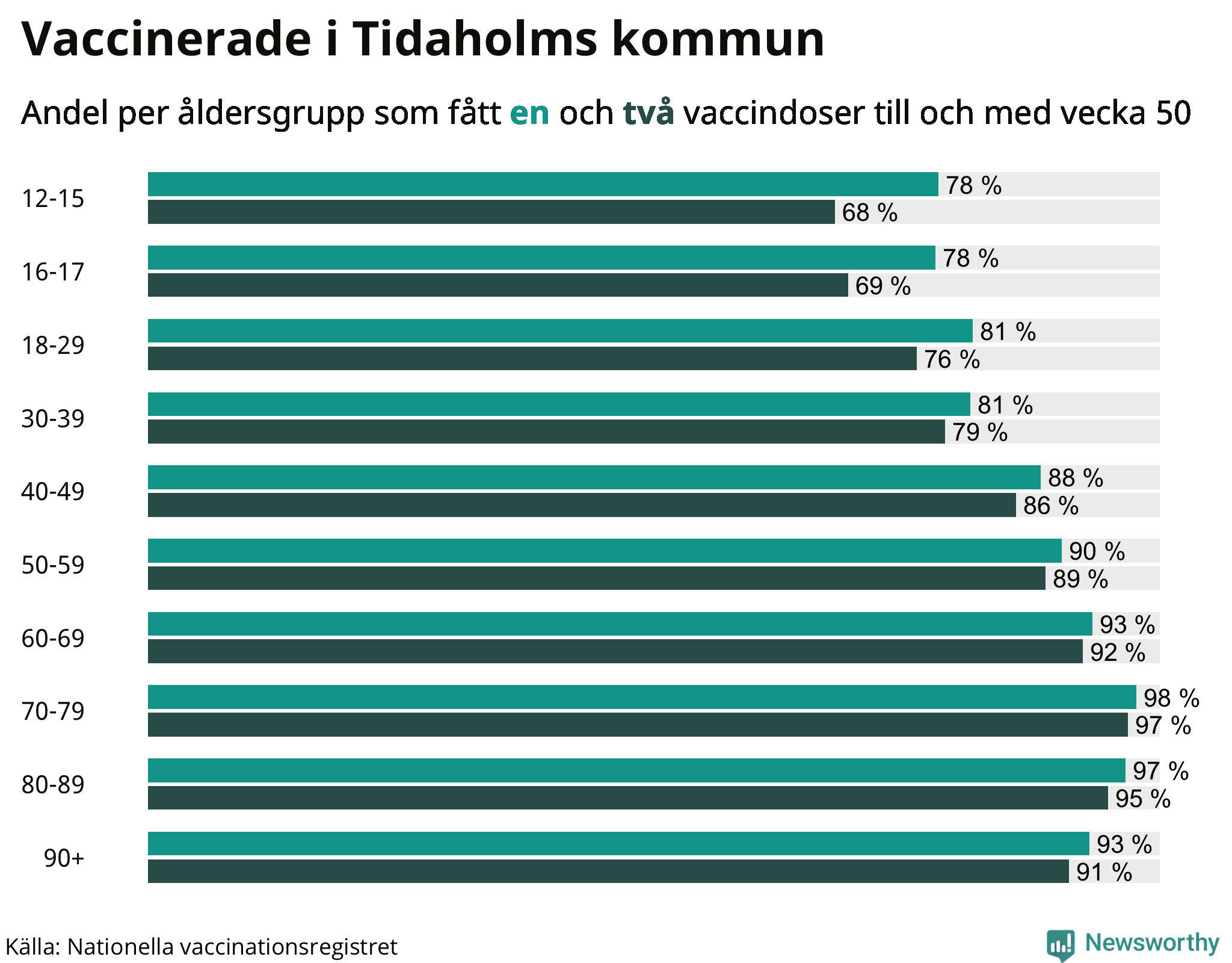 Äldre personer är betydligt mer sårbara för det nya coronaviruset än yngre. Därför har äldre prioriterats i vaccineringen. De äldsta var också först ut att erbjudas en tredje påfyllnadsdos. I Tidaholm har hittills 781 personer – eller 78 procent av 80-plussarna – fått en tredje spruta. Det placerar Tidaholm i mittenskiktet av landets kommuner.