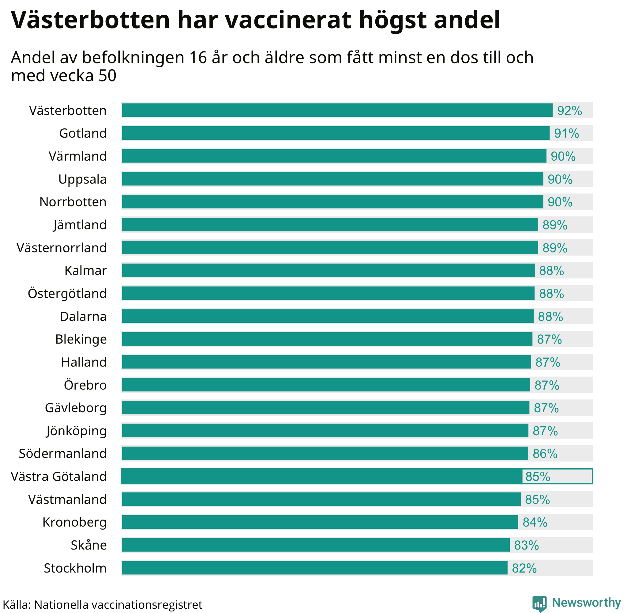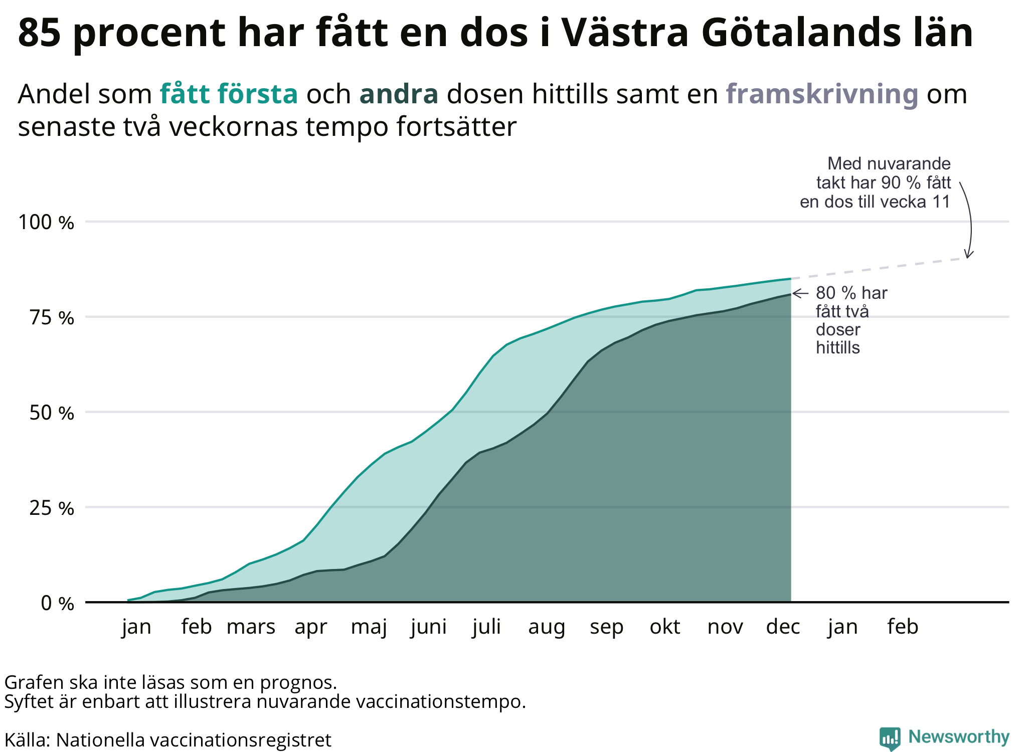 I hela Västra Götalands län har 85 procent av befolkningen har fått en första dos.