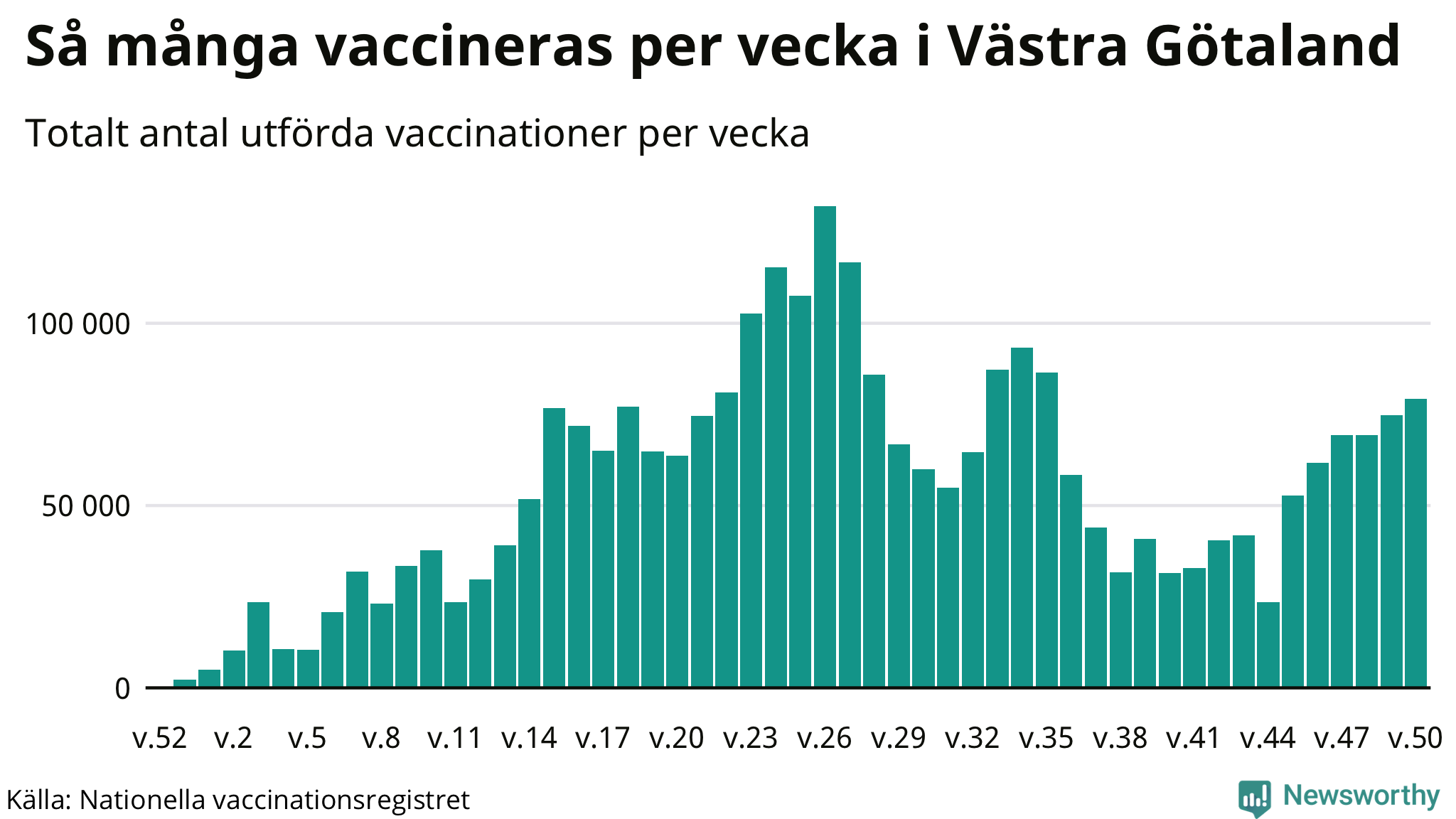 I massvaccinationens mest intensiva fas, i början av juli, delades som mest mer än 130 000 vaccindoser i veckan ut i Västra Götalands län. I takt med att de flesta fått sina första doser minskade tempot. Nu pågår vaccinationen av 12-15-åringar och utdelningen av tredje dosen. Regeringen har gett Folkhälsomyndigheten i uppdrag att inför en nationell vaccinationsvecka under vecka 11.
