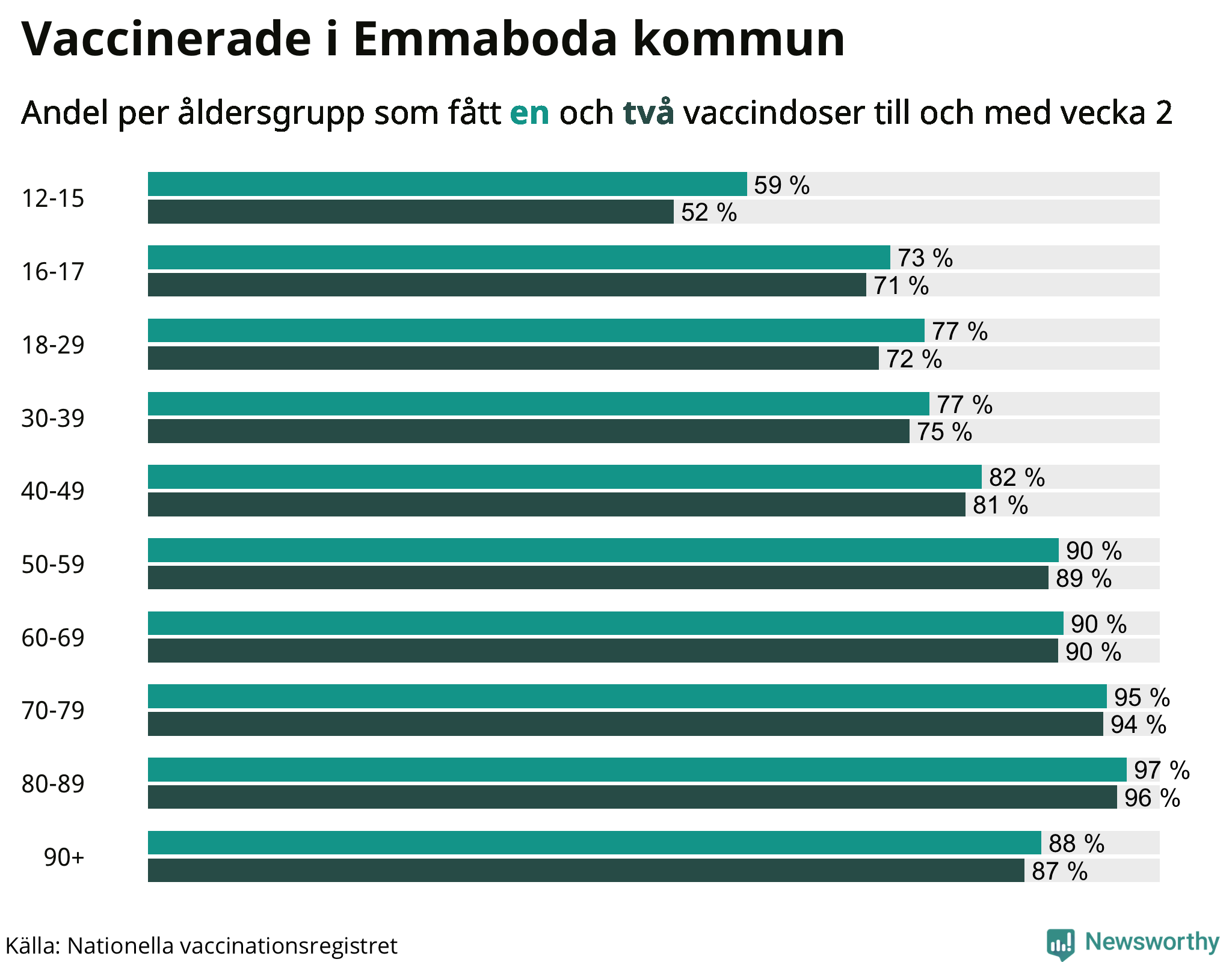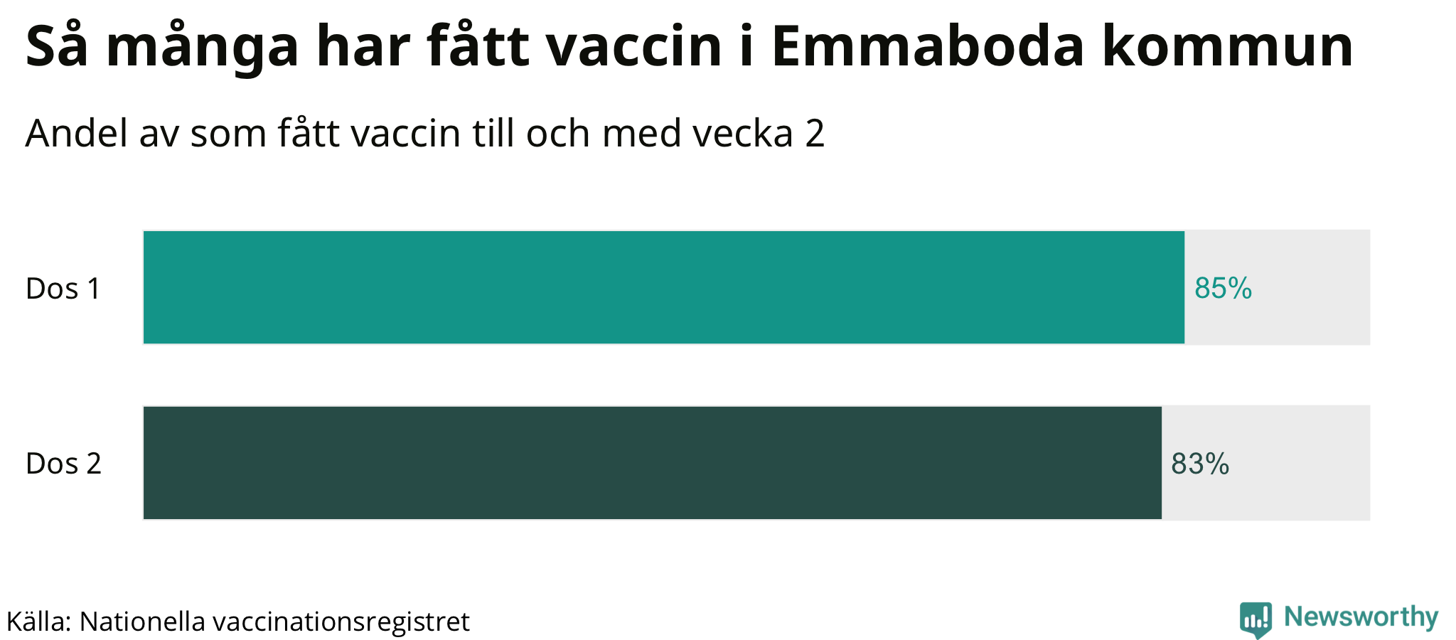 Totalt har 7 077 personer i Emmaboda fått sin första vaccindos fram till vecka två, enligt Nationella vaccinationsregistret. Det innebär att 85 procent av befolkningen fått minst en dos. Det är en lägre andel än i de flesta andra kommuner. Hammarö kommun har vaccinerat flest i hela landet (94 procent).
