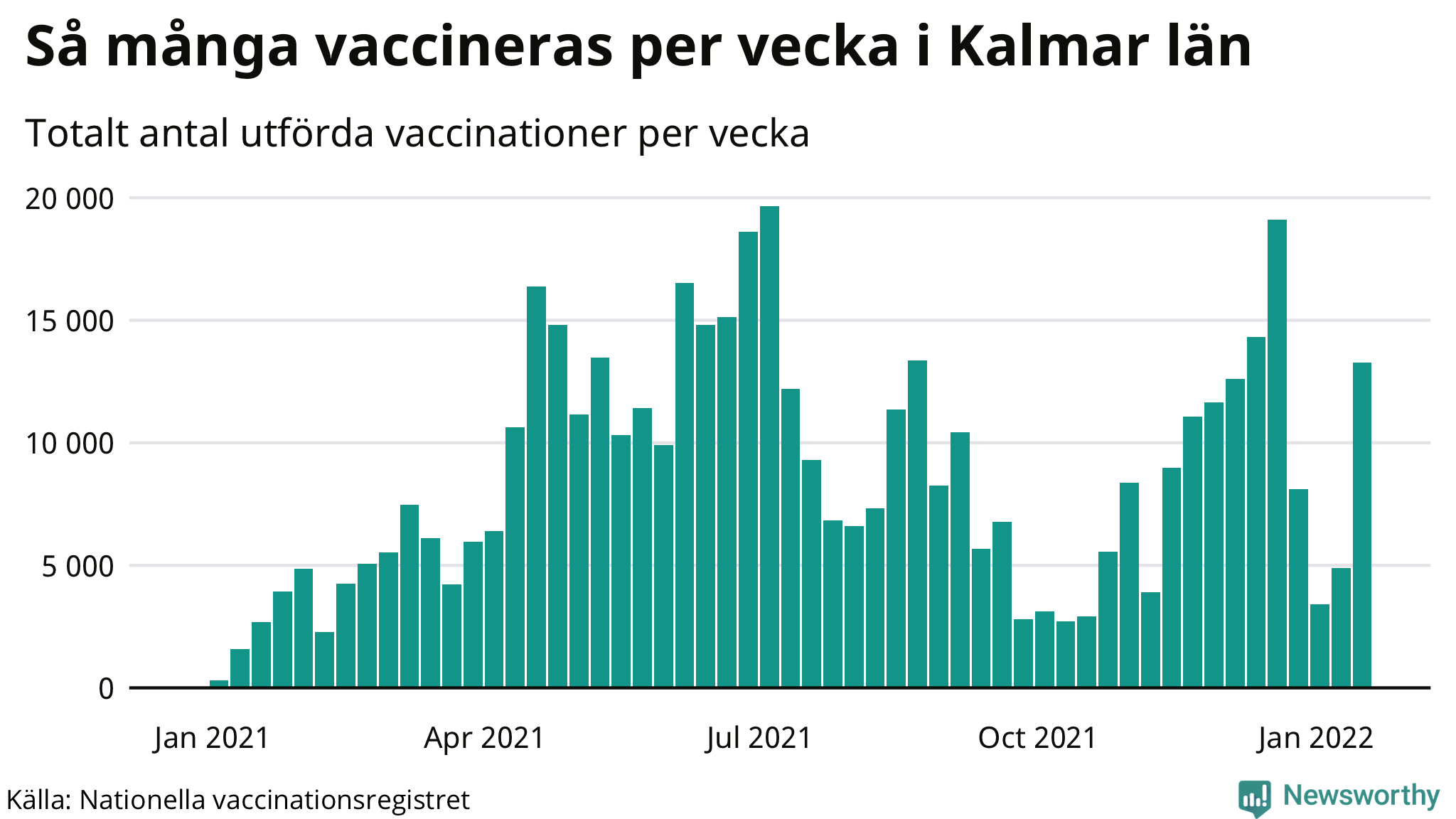 I massvaccinationens mest intensiva fas, i början av juli, delades som mest mer än 19 000 vaccindoser i veckan ut i Kalmar län. I takt med att de flesta fått sina första doser minskade tempot. Nu pågår vaccinationen av 12-15-åringar och utdelningen av tredje dosen. Regeringen har gett Folkhälsomyndigheten i uppdrag att inför en nationell vaccinationsvecka under vecka 11.