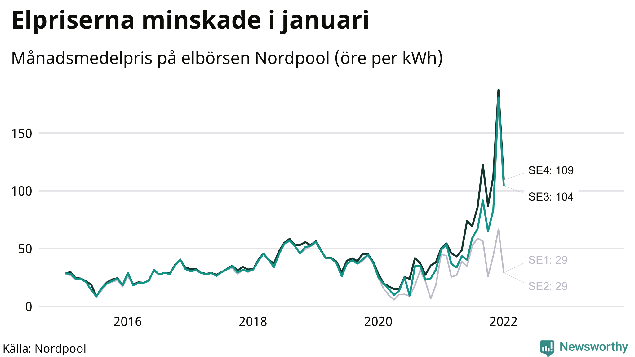 Efter rekordnoteringen i december sjönk spotpriset – alltså det pris som elbolagen betalar för att köpa in elen – i Kalmar län. I elområde 4, där bland annat Oskarshamns tätort och Högsby ligger, noterades ett månadspris i januari på 109 öre per kilowattimme vilket kan jämföras med 187 öre i december. I elområde 3 – där till exempel Oskarshamns kärnkraftverk och Hultsfred ligger – kostade en kilowattimme 104 öre. Där kostade elen 181 öre månaden innan. Det senaste året har prisskillnaden mellan de båda områdena i snitt varit 15 öre per kilowattimme.
