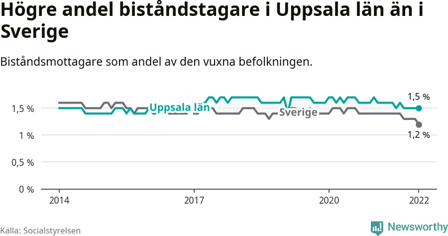 Totalt fick 5 873 personer i Uppsala län ekonomiskt bistånd stöd under januari, vilket alltså motsvarar 1,5 procent av den vuxna befolkningen. Det är ungefär lika stor andel som föregående månad. Sedan samma månad förra året innebär det en minskning med 0,2 procentenheter.