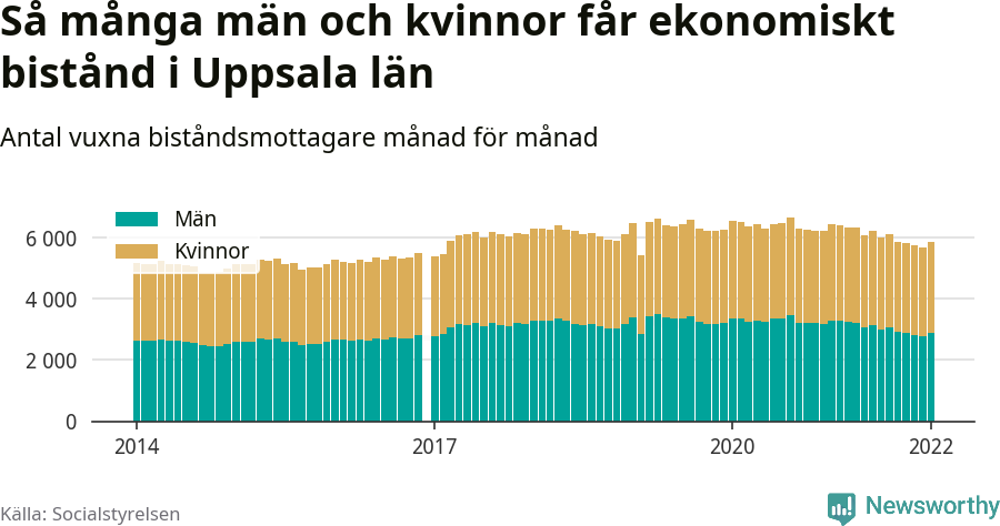 Av biståndstagarna i Uppsala län var förra månaden 2 985 kvinnor och 2 888 män.