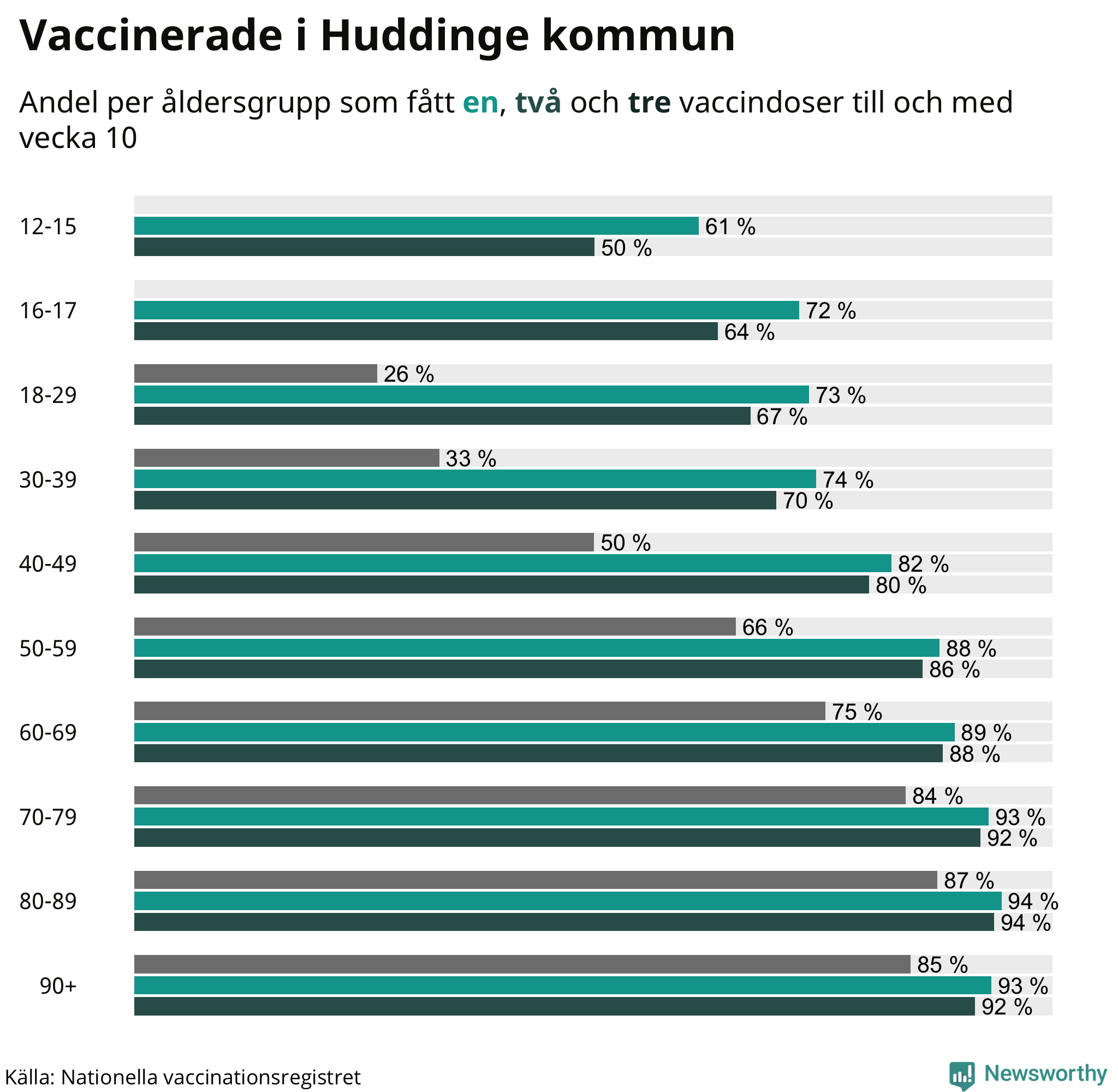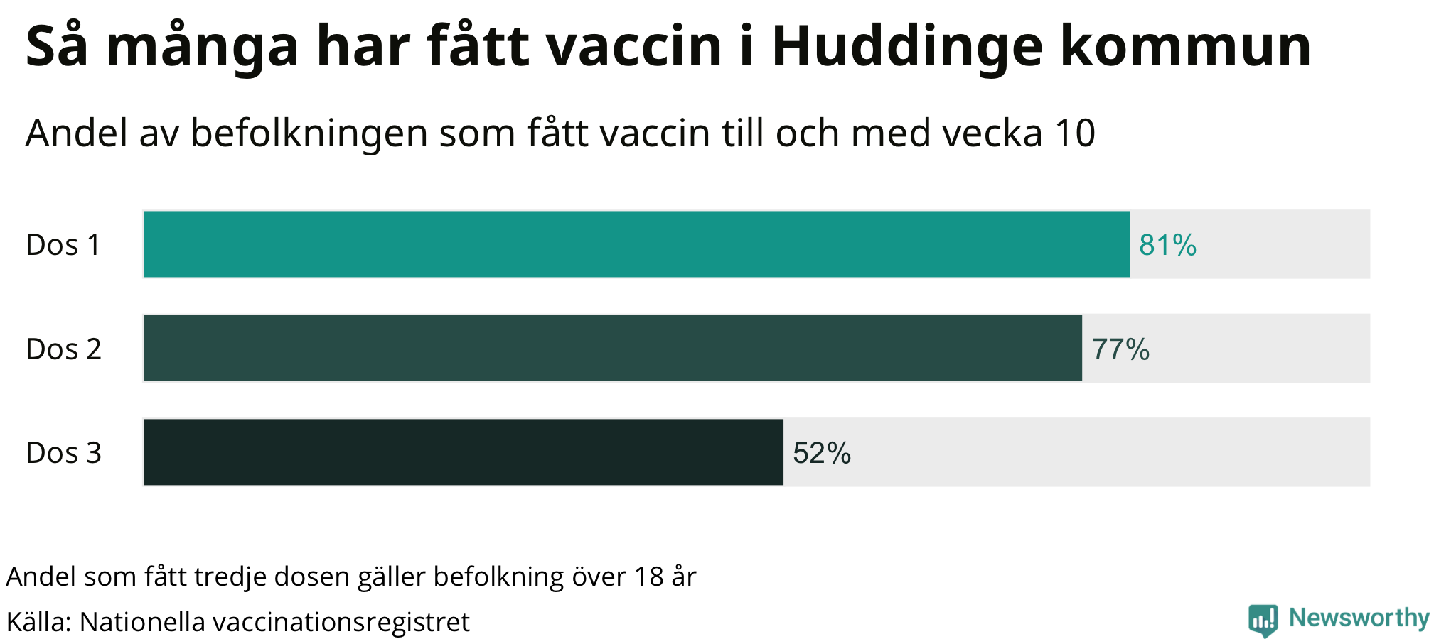 Totalt har 76 987 personer i Huddinge fått sin första vaccindos fram till vecka tio, enligt Nationella vaccinationsregistret. Det innebär att 81 procent av befolkningen fått minst en dos. Det är en lägre andel än i de flesta andra kommuner. Hammarö kommun har vaccinerat flest i hela landet (95 procent).
