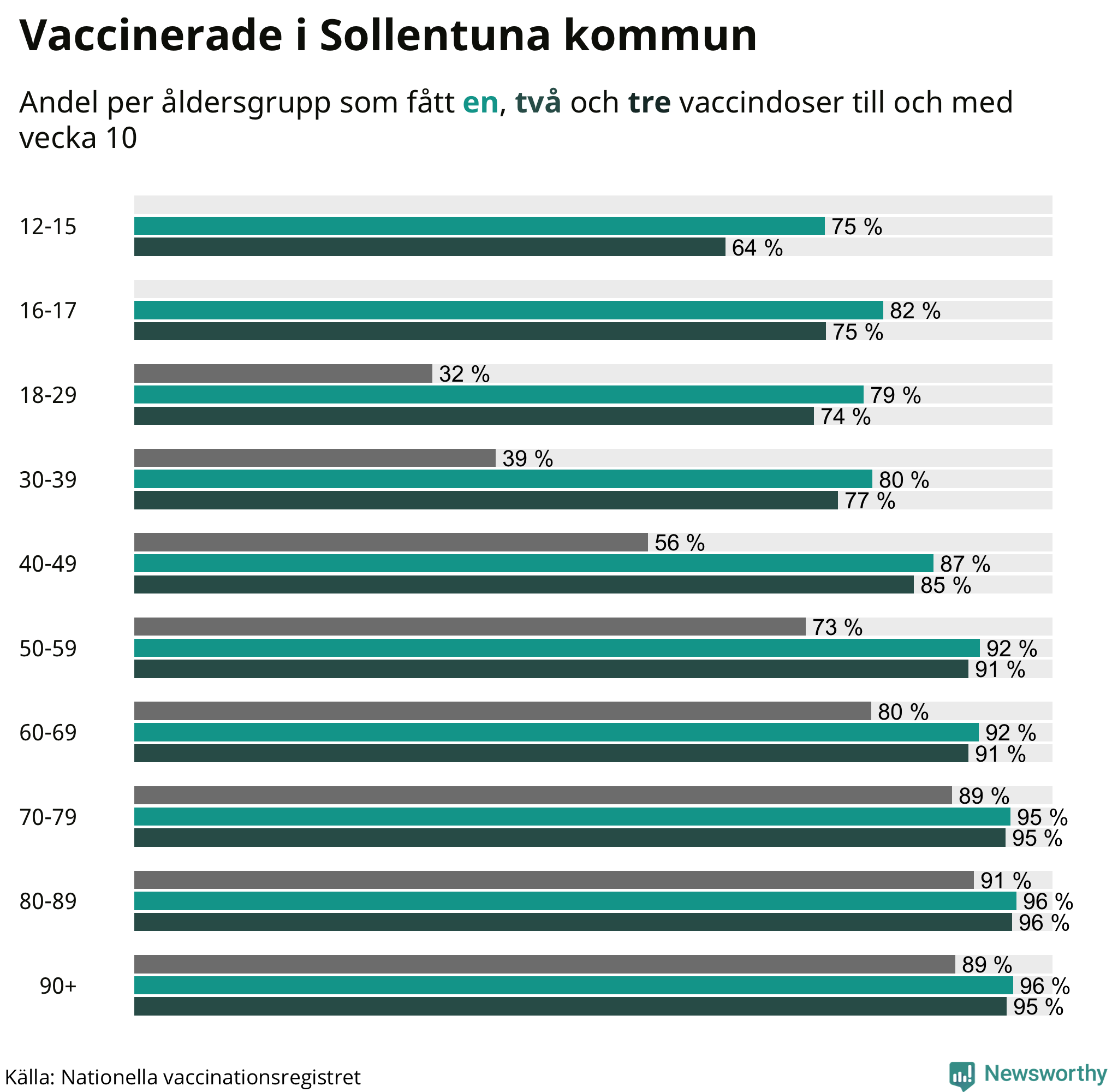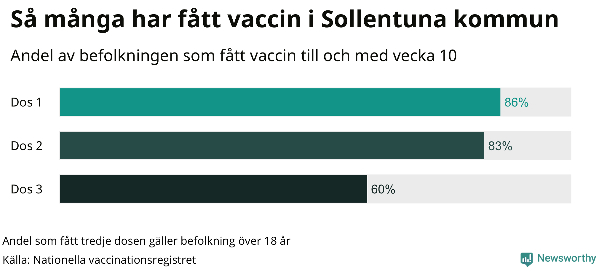 Totalt har 54 829 personer i Sollentuna fått sin första vaccindos fram till vecka tio, enligt Nationella vaccinationsregistret. Det innebär att 86 procent av befolkningen fått minst en dos. Det är en lägre andel än i de flesta andra kommuner. Hammarö kommun har vaccinerat flest i hela landet (95 procent).
