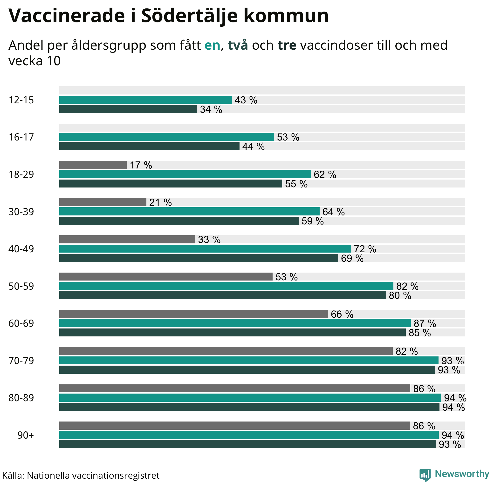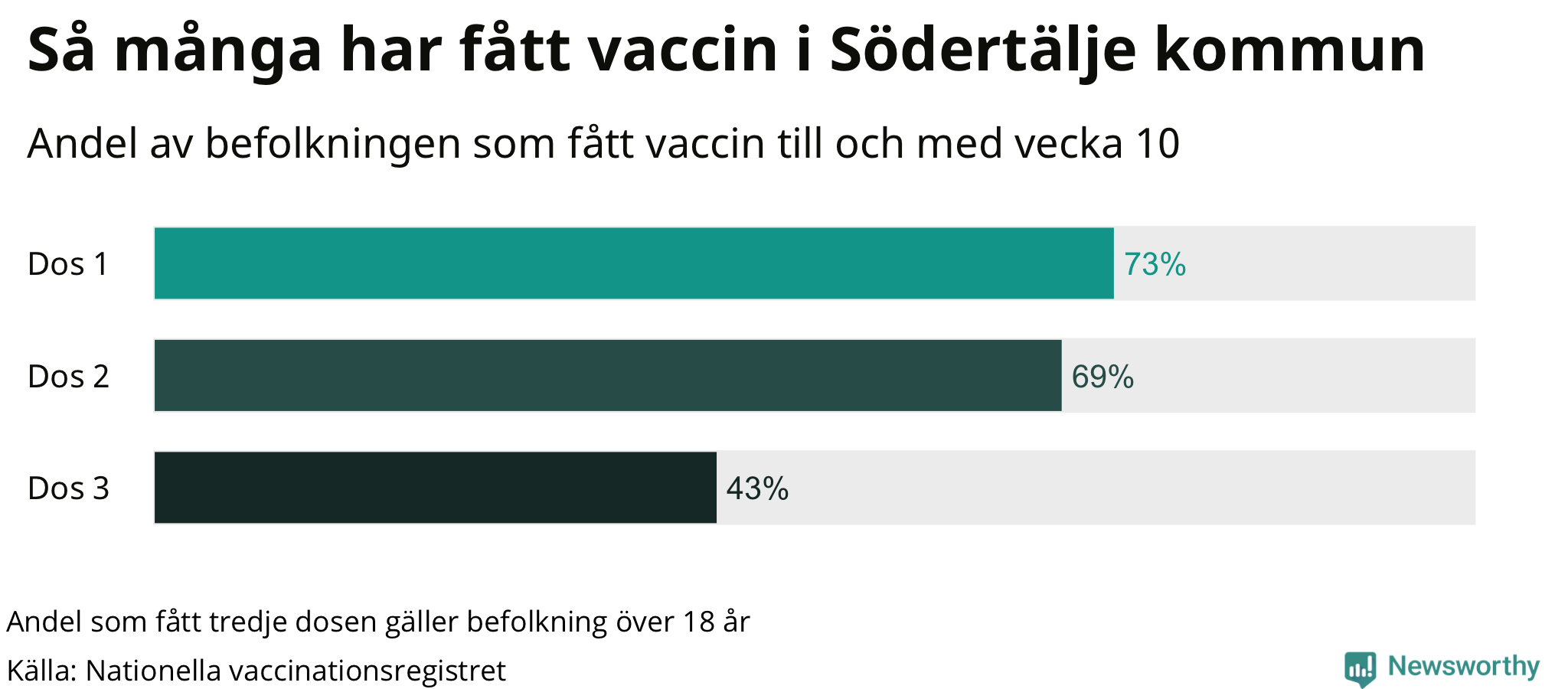 Totalt har 62 797 personer i Södertälje fått sin första vaccindos fram till vecka tio, enligt Nationella vaccinationsregistret. Det innebär att 73 procent av befolkningen fått minst en dos. Det är den näst lägsta andelen i Sverige. Hammarö kommun har vaccinerat flest i hela landet (95 procent).