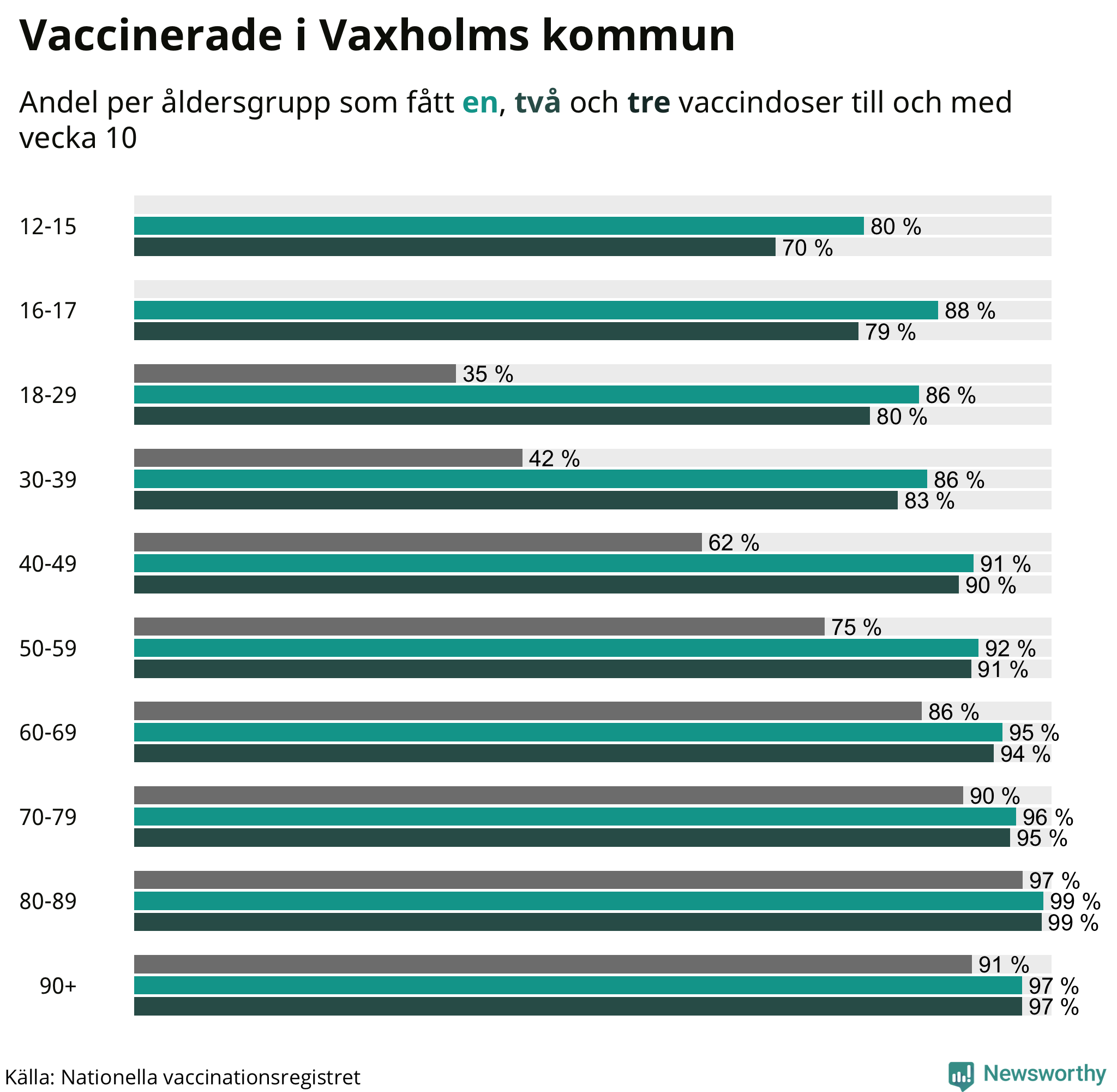 Totalt har 9 406 personer i Vaxholm fått sin första vaccindos fram till vecka tio, enligt Nationella vaccinationsregistret. Det innebär att 91 procent av befolkningen fått minst en dos. Det är en större andel än i de flesta andra kommuner. Hammarö kommun har vaccinerat flest i hela landet (95 procent).