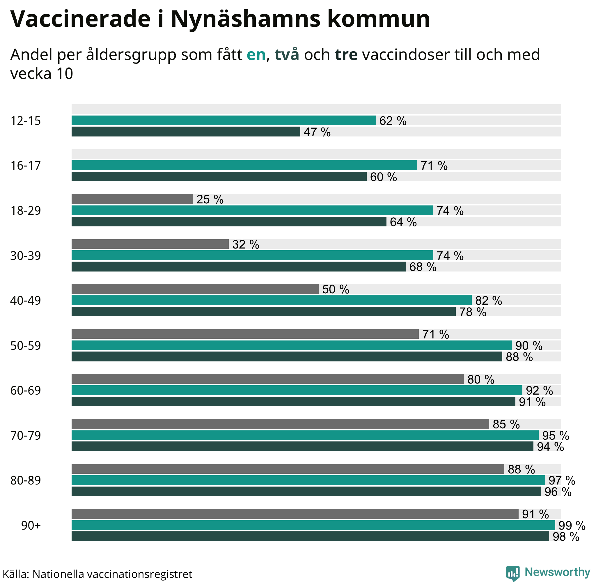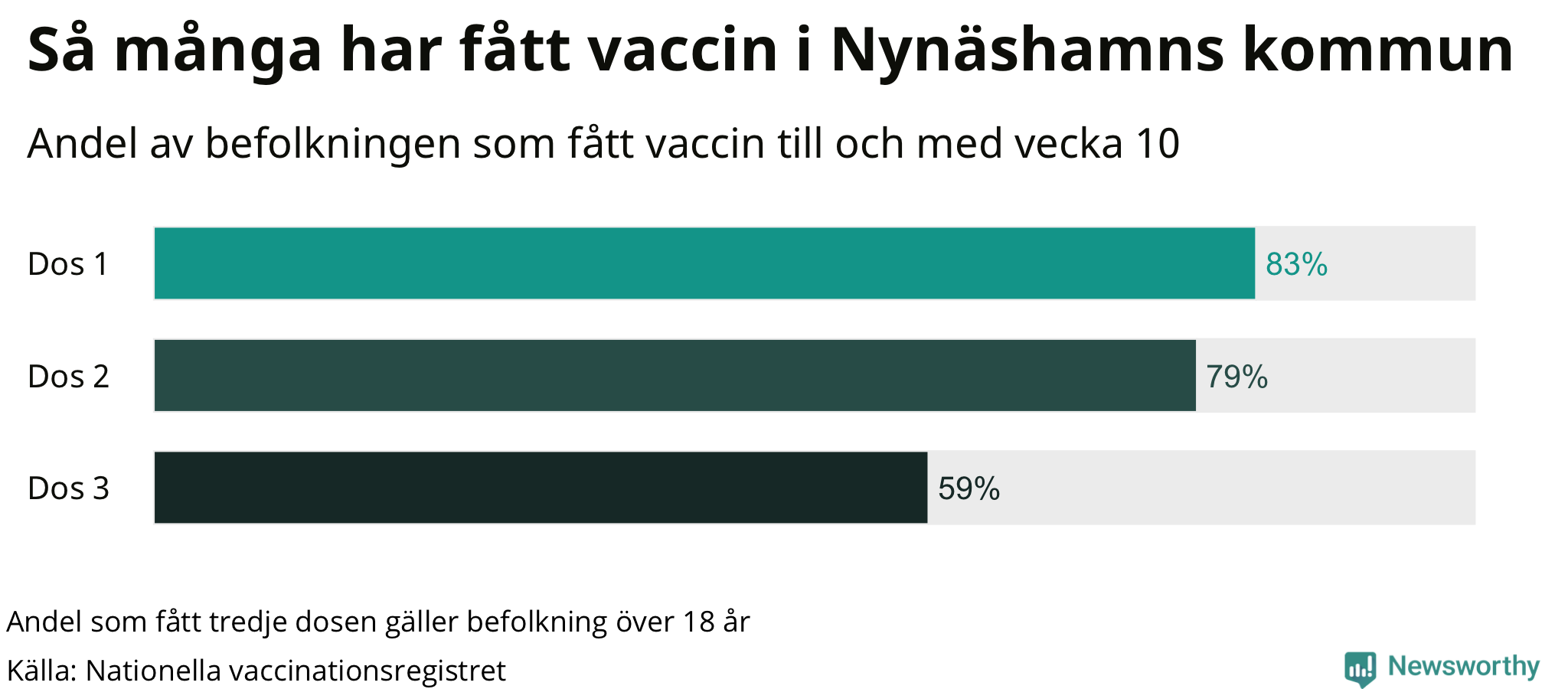 Totalt har 21 188 personer i Nynäshamn fått sin första vaccindos fram till vecka tio, enligt Nationella vaccinationsregistret. Det innebär att 83 procent av befolkningen fått minst en dos. Det är en lägre andel än i de flesta andra kommuner. Hammarö kommun har vaccinerat flest i hela landet (95 procent).