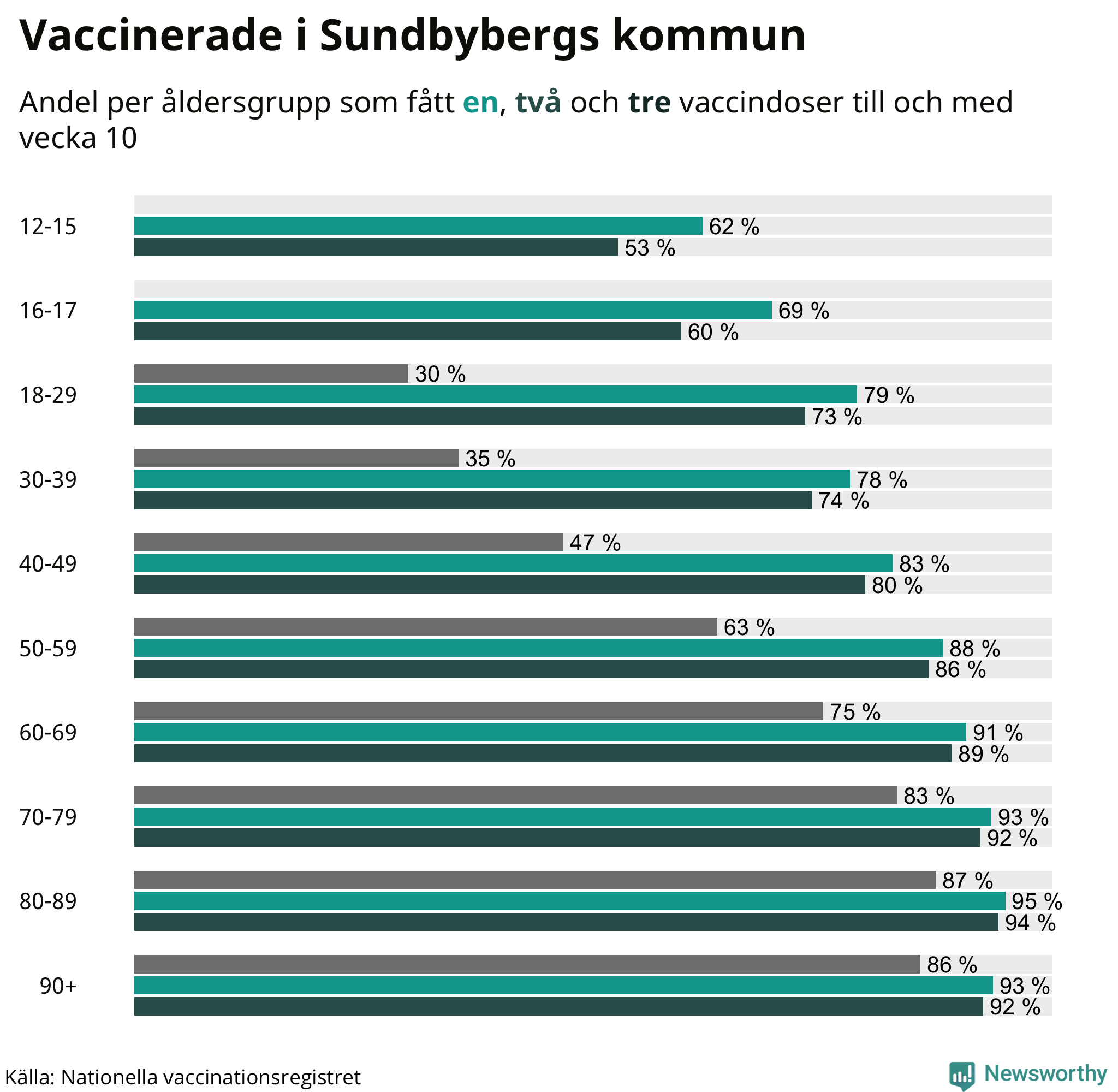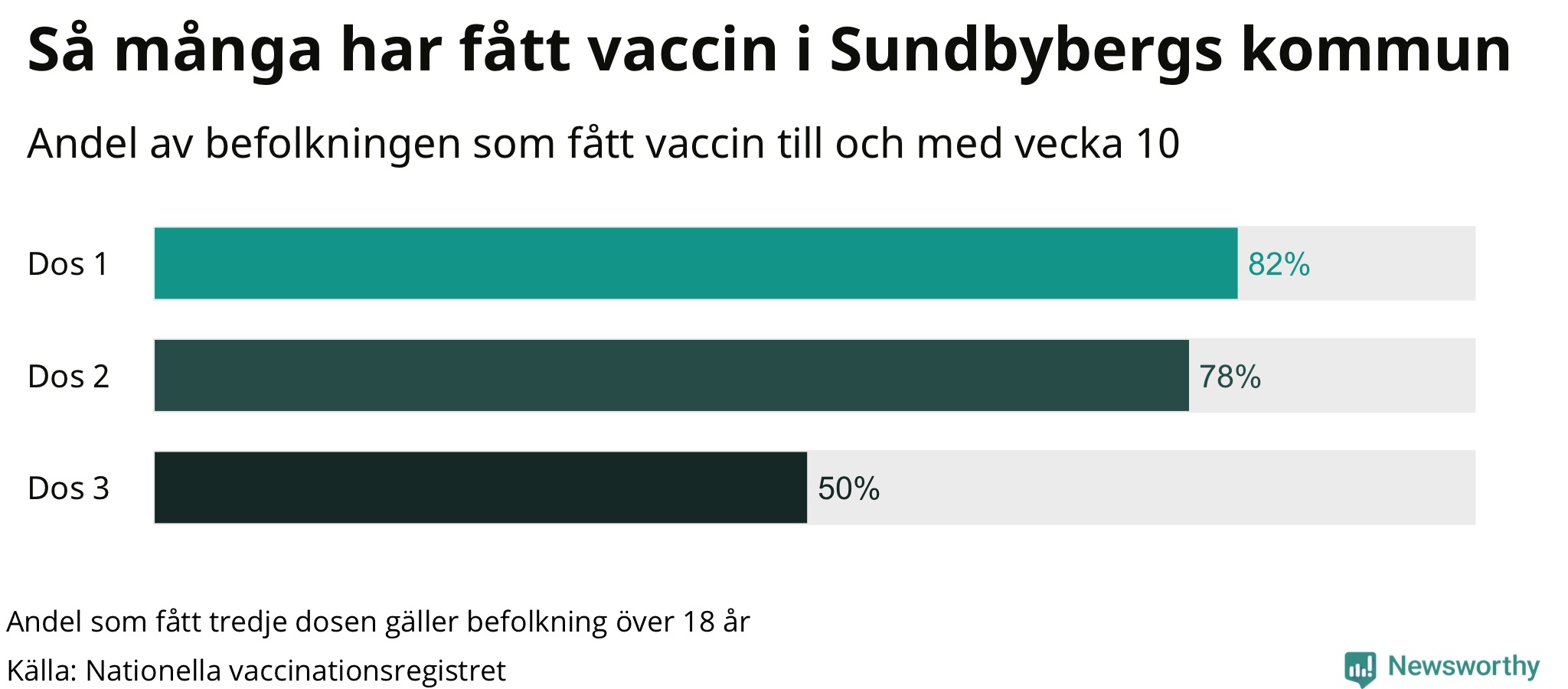 Totalt har 37 598 personer i Sundbyberg fått sin första vaccindos fram till vecka tio, enligt Nationella vaccinationsregistret. Det innebär att 82 procent av befolkningen fått minst en dos. Det är en lägre andel än i de flesta andra kommuner. Hammarö kommun har vaccinerat flest i hela landet (95 procent).