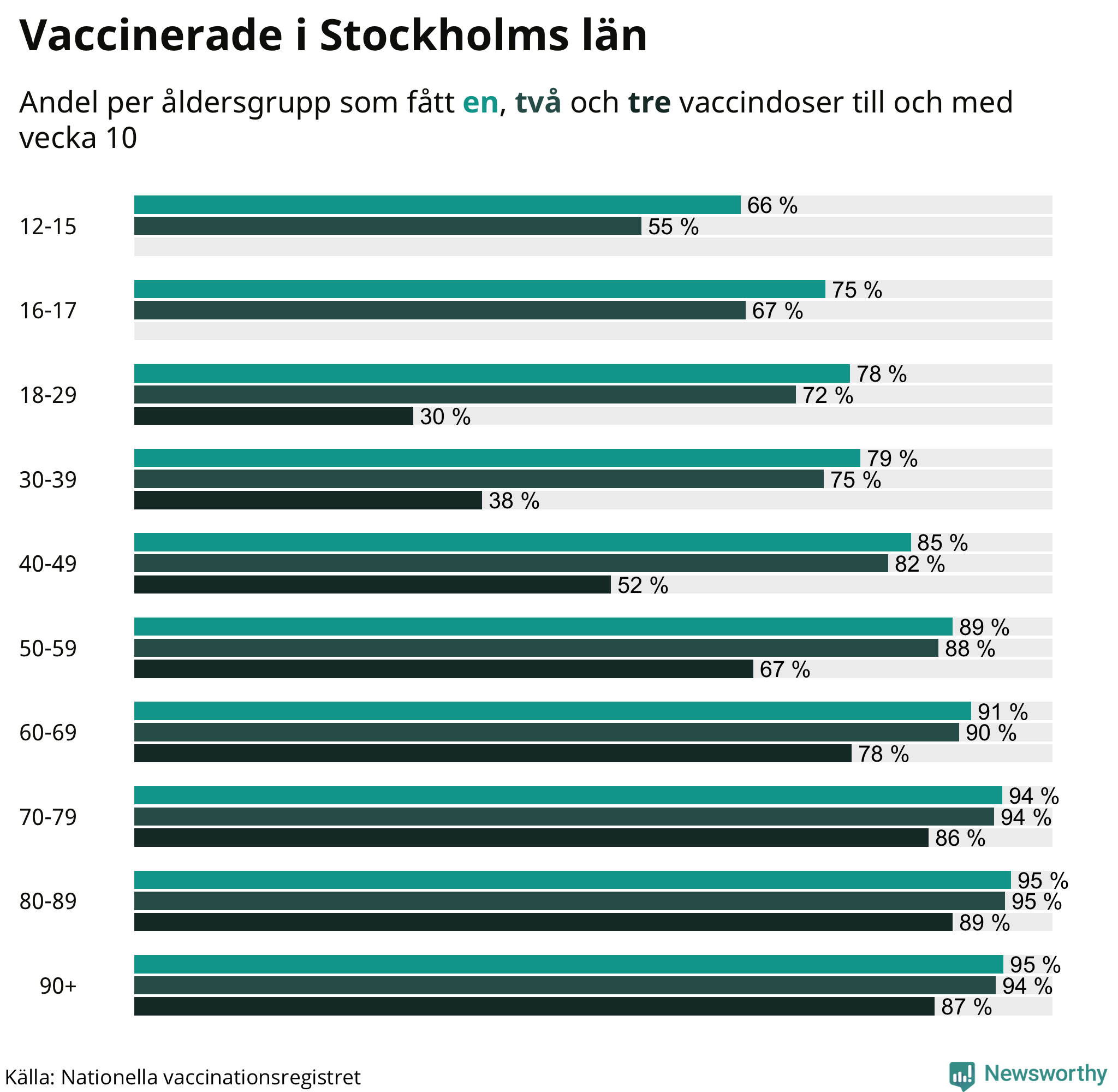 Totalt har 1 731 677 personer i Stockholms län fått sin första vaccindos fram till vecka tio, enligt Nationella vaccinationsregistret. Det innebär att 84 procent av befolkningen fått minst en dos. Det är den näst lägsta andelen i Sverige. Västerbottens län har vaccinerat flest i hela landet (93 procent).