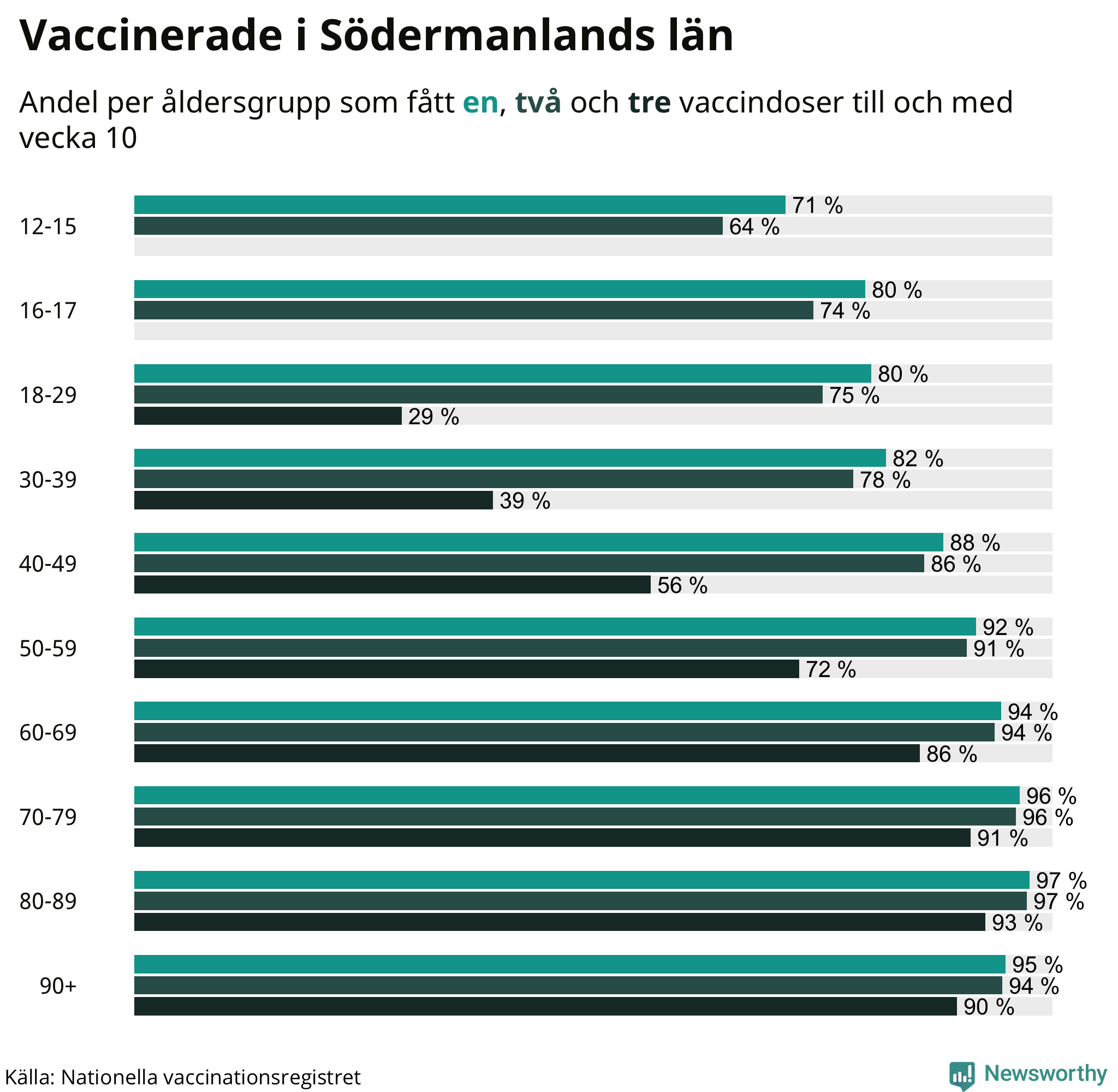 Totalt har 227 083 personer i Södermanland fått sin första vaccindos fram till vecka tio, enligt Nationella vaccinationsregistret. Det innebär att 88 procent av befolkningen fått minst en dos. Det är en lägre andel än i de flesta andra län. Västerbottens län har vaccinerat flest i hela landet (93 procent).