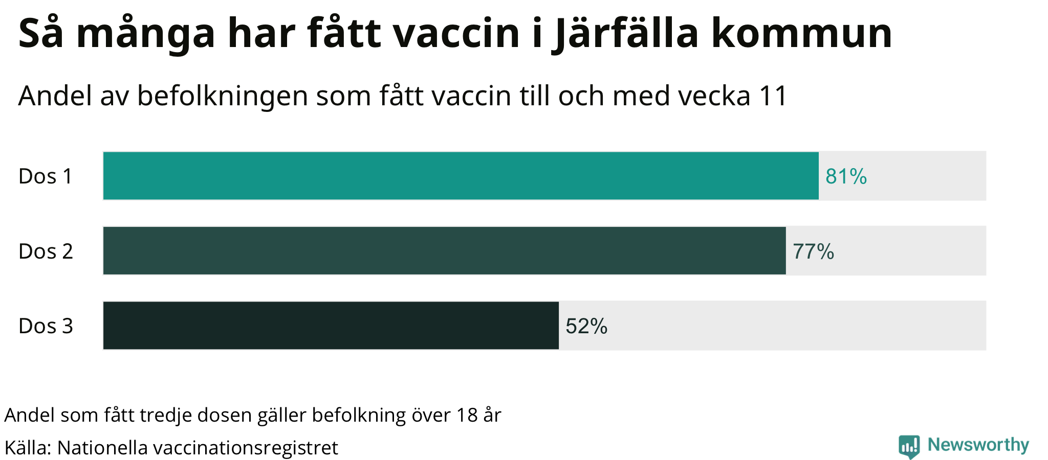 Totalt har 57 111 personer i Järfälla fått sin första vaccindos fram till vecka elva, enligt Nationella vaccinationsregistret. Det innebär att 81 procent av befolkningen fått minst en dos. Det är en lägre andel än i de flesta andra kommuner. Hammarö kommun har vaccinerat flest i hela landet (95 procent).
