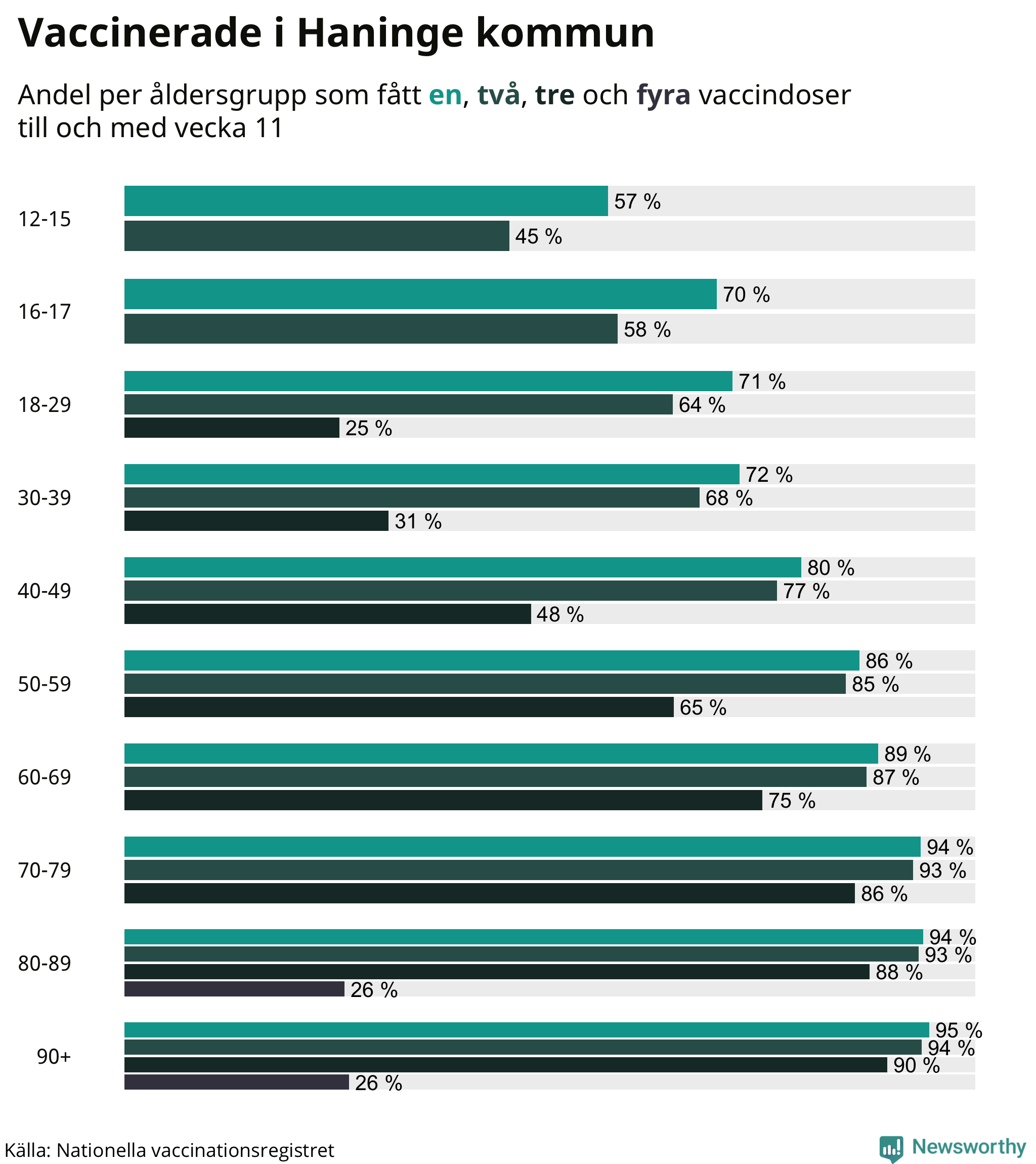 Äldre personer är betydligt mer sårbara för det nya coronaviruset än yngre. Därför har äldre prioriterats i vaccineringen. Personer över 80 år rekommenderas numera att ta en fjärde vaccinationsdos. I Haninge har hittills 876 personer – eller 26 procent av 80-plussarna – fått en fjärde spruta.