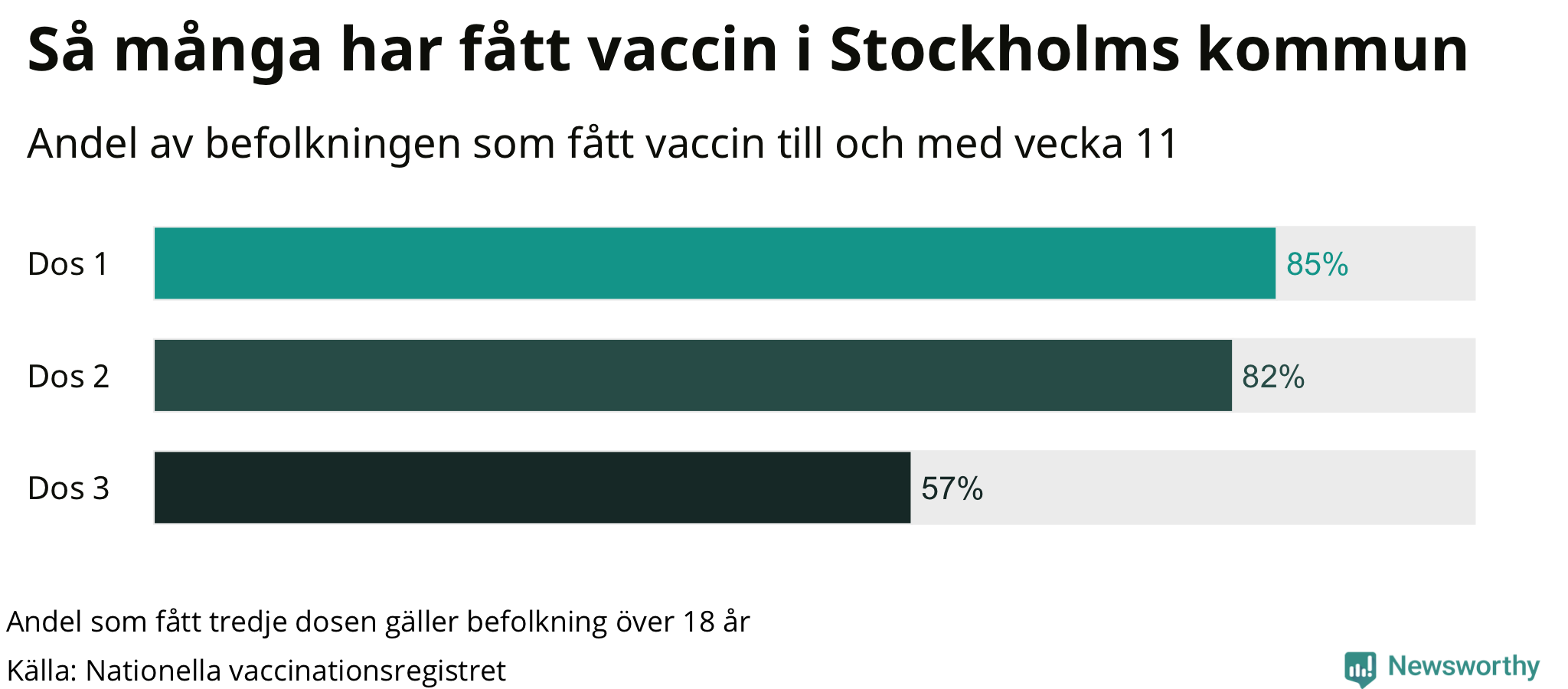 Totalt har 719 265 personer i Stockholms kommun fått sin första vaccindos fram till vecka elva, enligt Nationella vaccinationsregistret. Det innebär att 85 procent av befolkningen fått minst en dos. Det är en lägre andel än i de flesta andra kommuner. Hammarö kommun har vaccinerat flest i hela landet (95 procent).