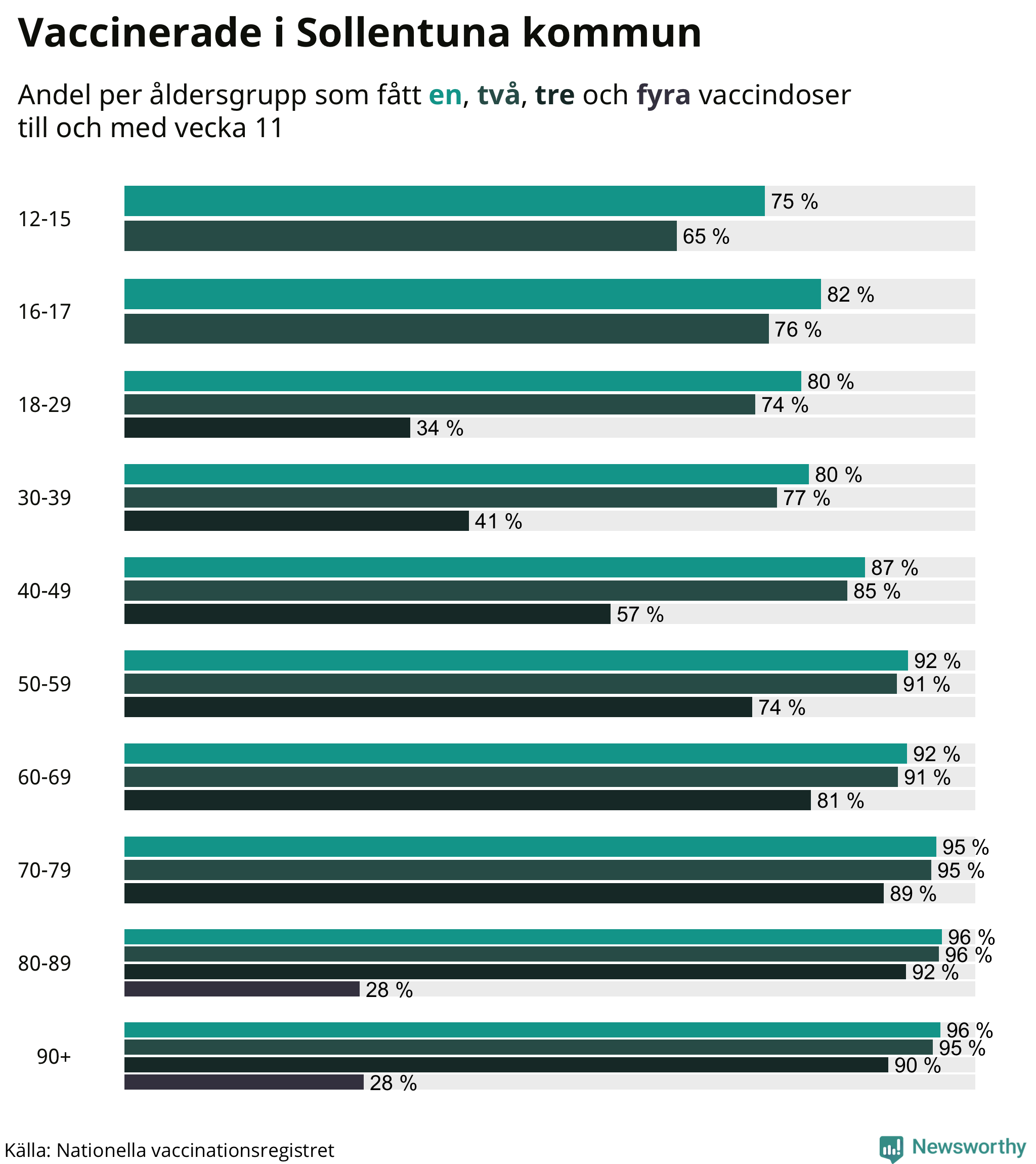 Äldre personer är betydligt mer sårbara för det nya coronaviruset än yngre. Därför har äldre prioriterats i vaccineringen. Personer över 80 år rekommenderas numera att ta en fjärde vaccinationsdos. I Sollentuna har hittills 888 personer – eller 28 procent av 80-plussarna – fått en fjärde spruta.