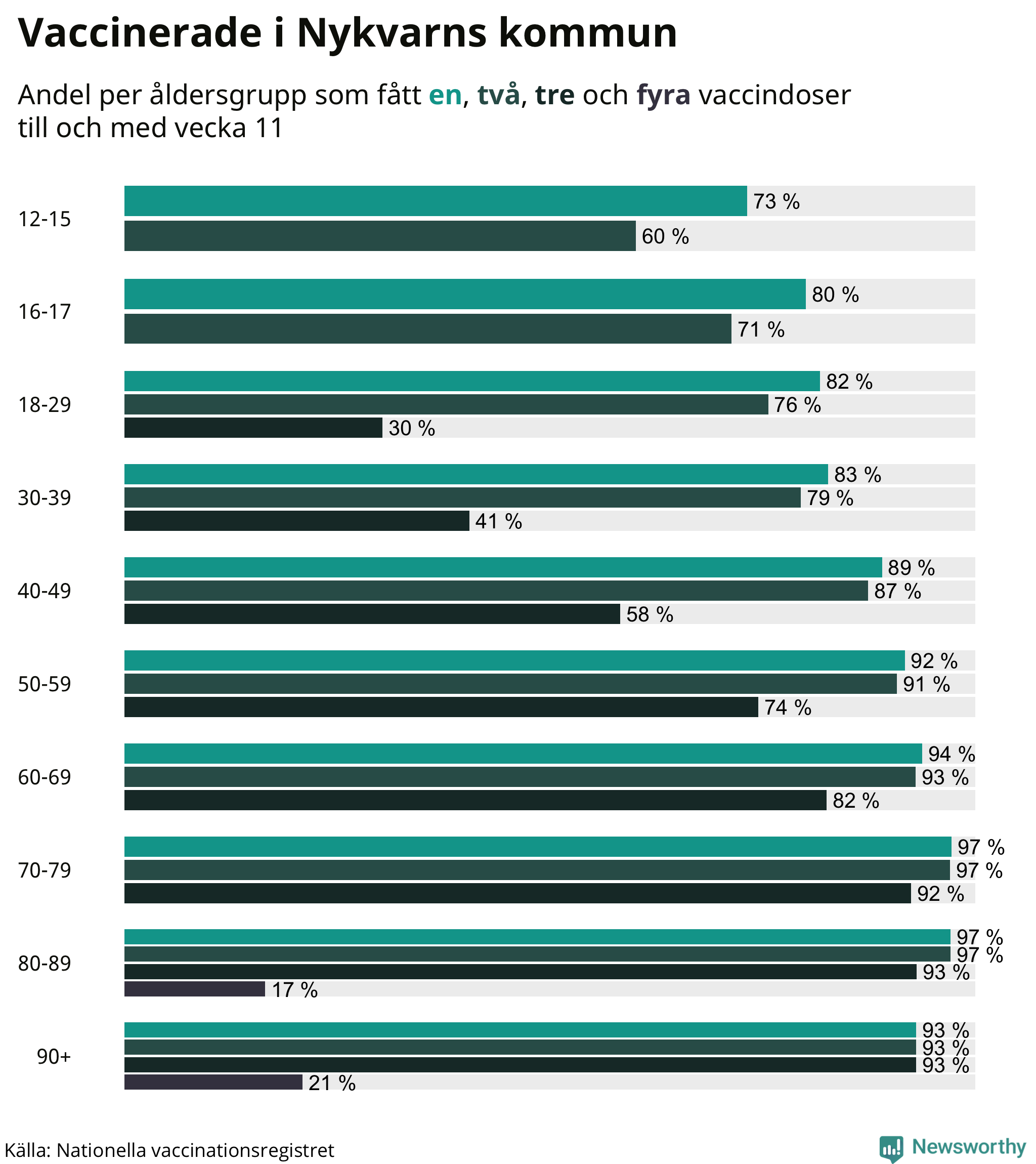 Totalt har 8 423 personer i Nykvarn fått sin första vaccindos fram till vecka elva, enligt Nationella vaccinationsregistret. Det innebär att 88 procent av befolkningen fått minst en dos. Det är en ganska genomsnittlig andel. Hammarö kommun har vaccinerat flest i hela landet (95 procent).
