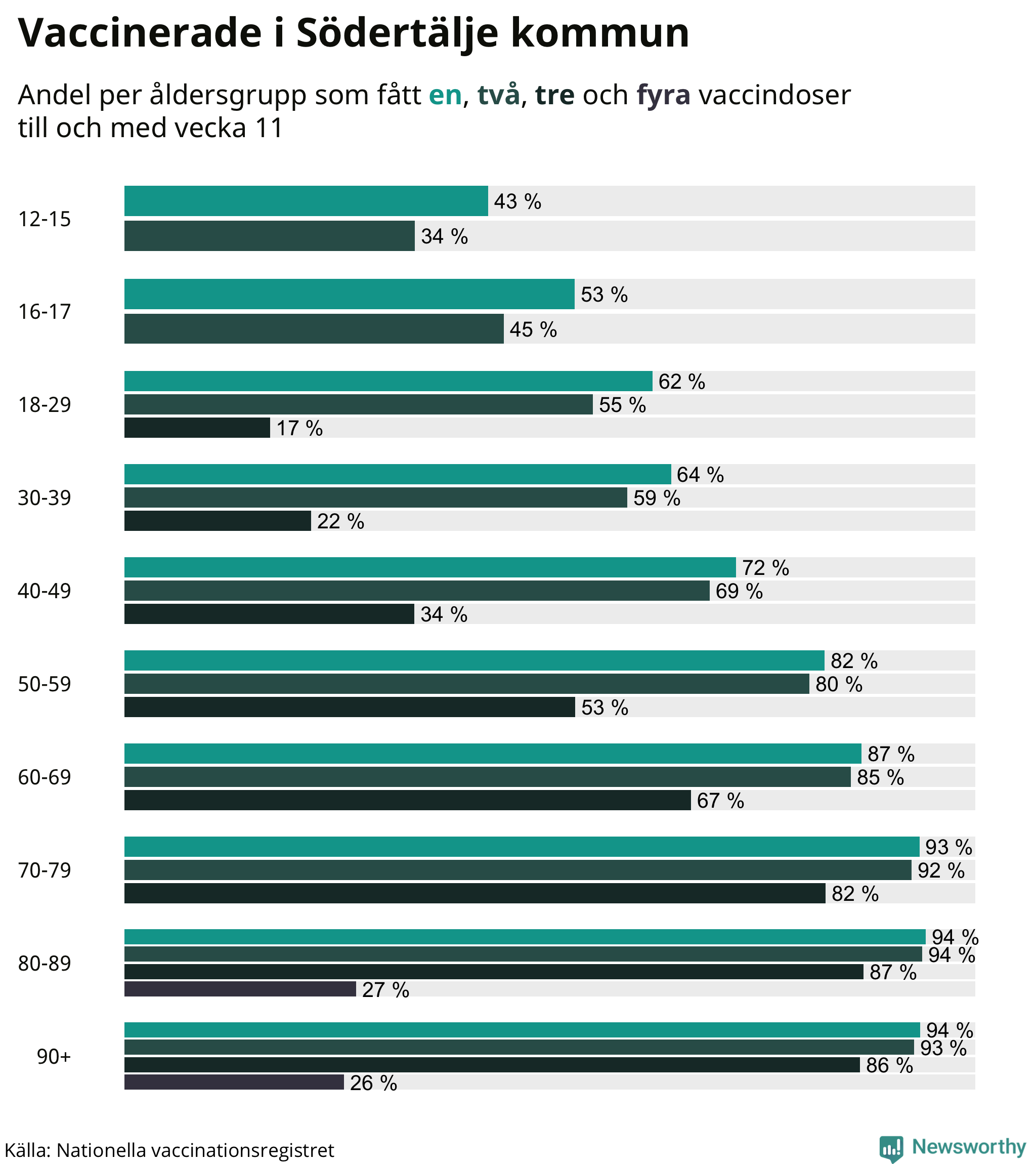 Äldre personer är betydligt mer sårbara för det nya coronaviruset än yngre. Därför har äldre prioriterats i vaccineringen. Personer över 80 år rekommenderas numera att ta en fjärde vaccinationsdos. I Södertälje har hittills 1 178 personer – eller 27 procent av 80-plussarna – fått en fjärde spruta.