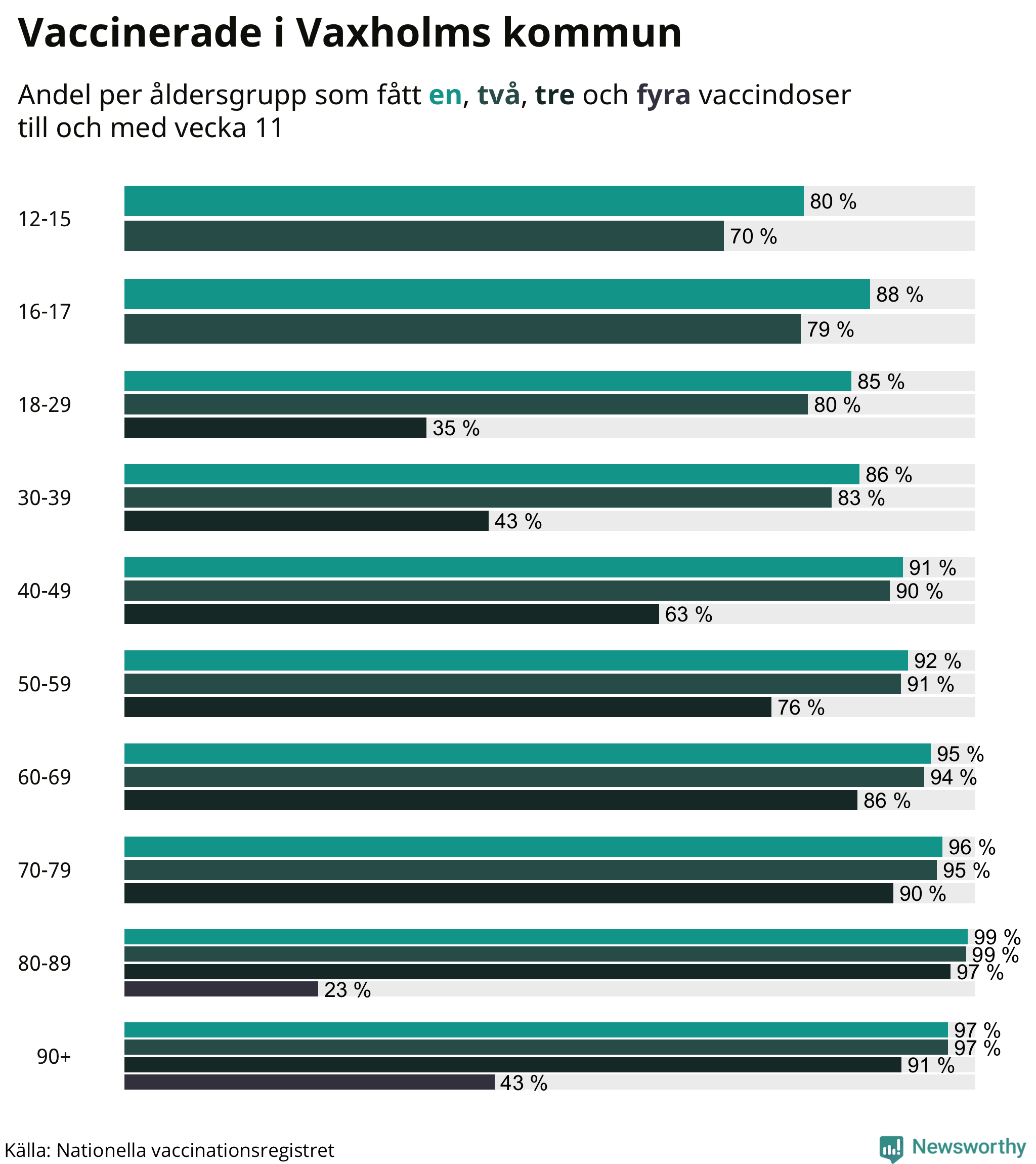 Äldre personer är betydligt mer sårbara för det nya coronaviruset än yngre. Därför har äldre prioriterats i vaccineringen. Personer över 80 år rekommenderas numera att ta en fjärde vaccinationsdos. I Vaxholm har hittills 141 personer – eller 26 procent av 80-plussarna – fått en fjärde spruta.