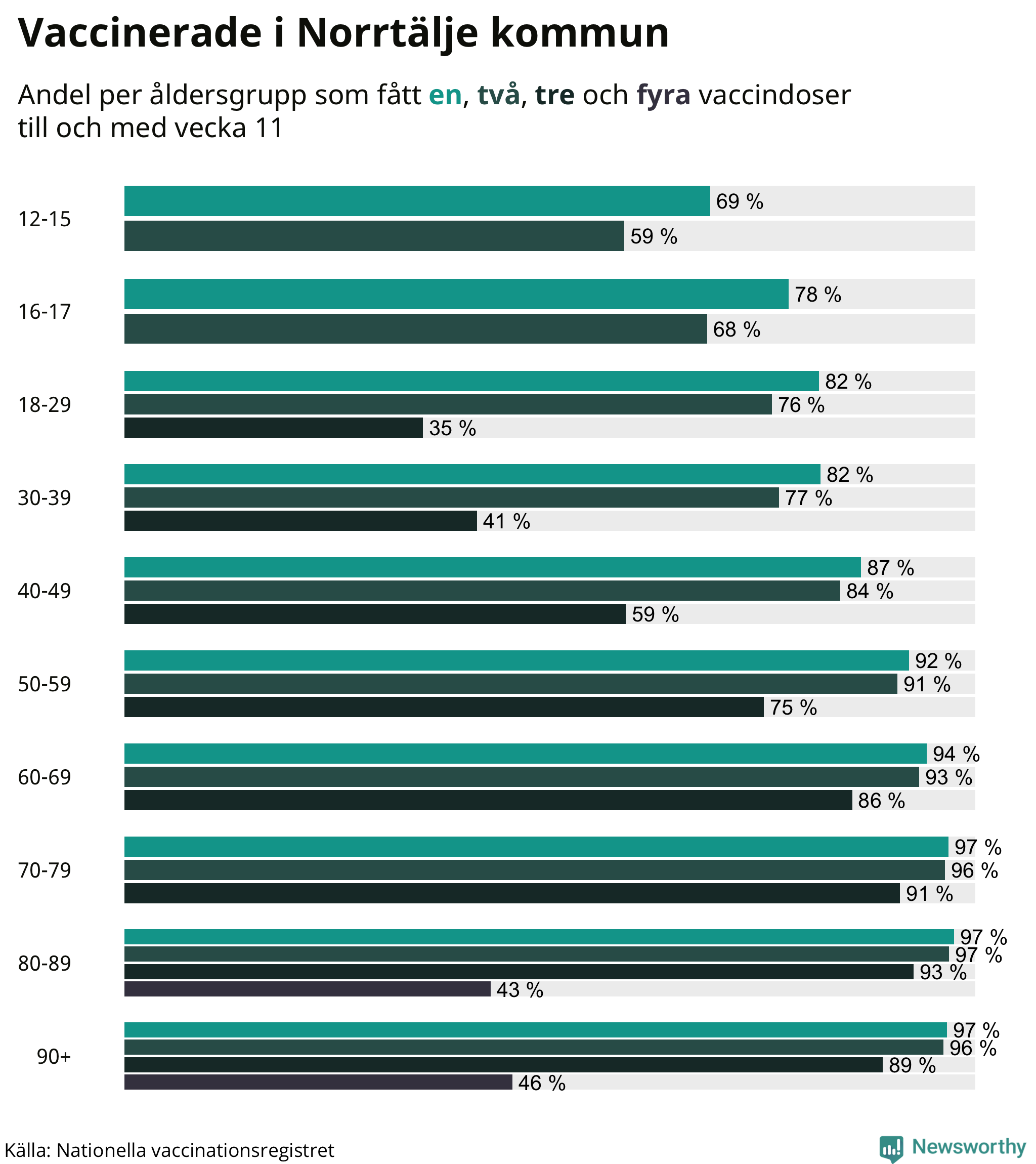 Äldre personer är betydligt mer sårbara för det nya coronaviruset än yngre. Därför har äldre prioriterats i vaccineringen. Personer över 80 år rekommenderas numera att ta en fjärde vaccinationsdos. I Norrtälje har hittills 1 924 personer – eller 43 procent av 80-plussarna – fått en fjärde spruta.
