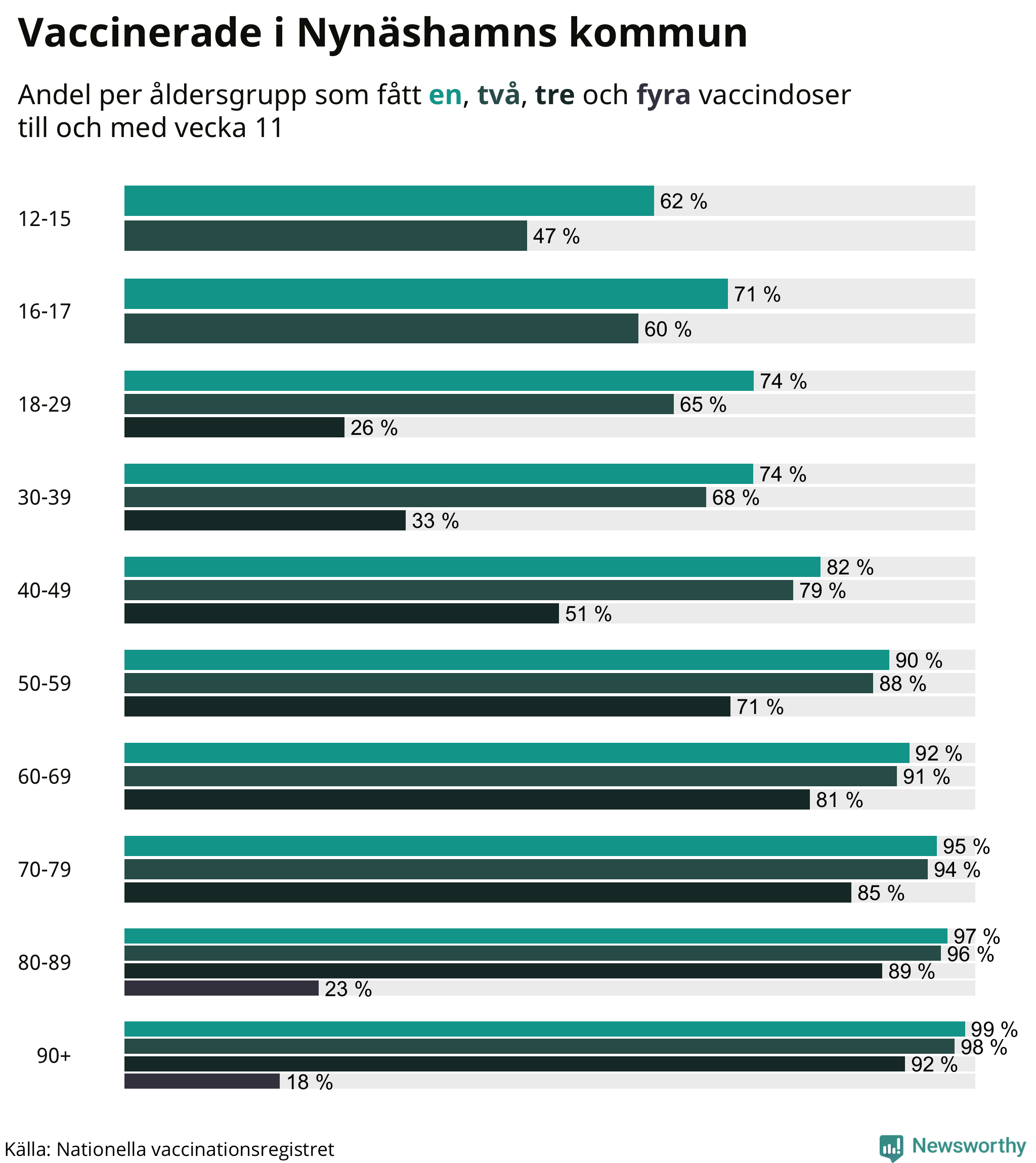 Totalt har 21 204 personer i Nynäshamn fått sin första vaccindos fram till vecka elva, enligt Nationella vaccinationsregistret. Det innebär att 84 procent av befolkningen fått minst en dos. Det är en lägre andel än i de flesta andra kommuner. Hammarö kommun har vaccinerat flest i hela landet (95 procent).